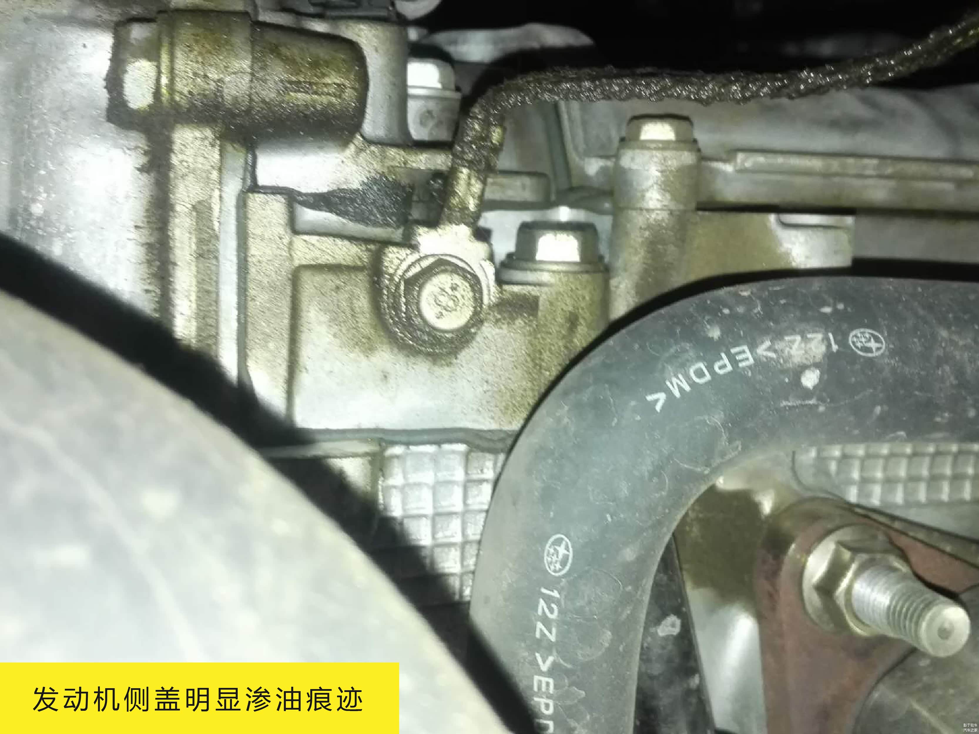 再仔细观察下发动机的周围,能看出发动机侧盖有明显的渗油痕迹,后面线路上的油应该是飘过去的,但这个位置渗油并不算严重,短期内并没有维修的必要。