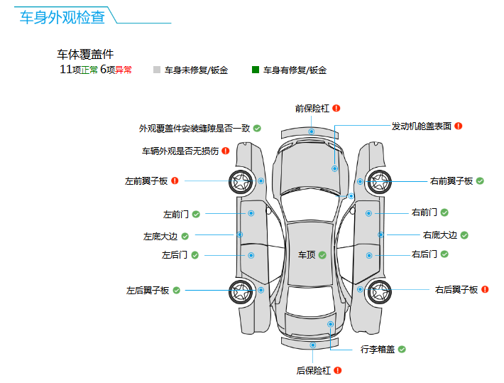 对于漆面的检测,更换的位置已经在上图中全部体现出来,没有任何的切割修复,都是简单的钣金喷漆。但这么多漆面修复你敢说3000公里?(如果真是3000,那驾驶技术得多差呀!)
