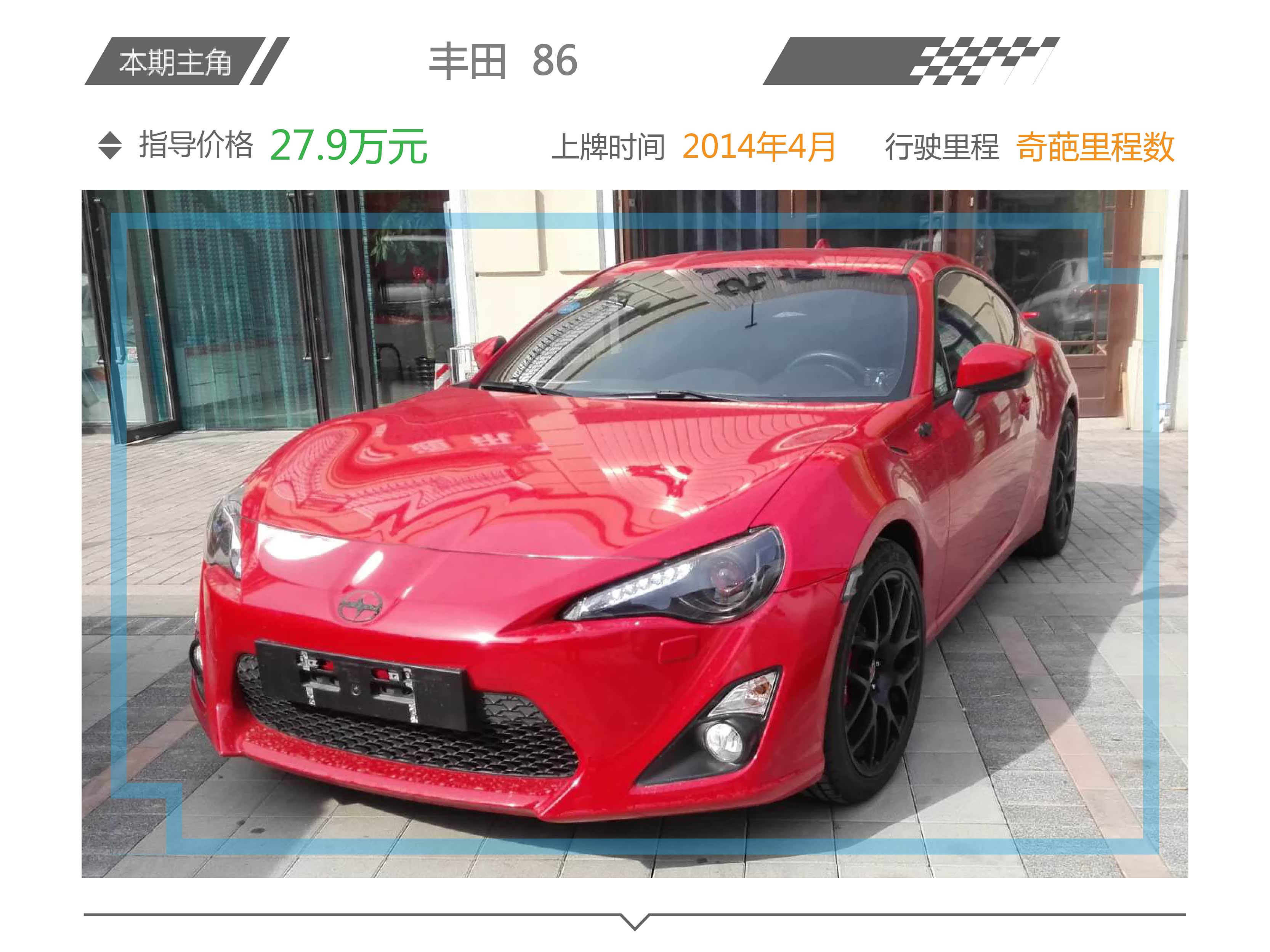 相信很多80、90后对“86”这两个字的感情都来源于《头文字D》这部动画,所以就会把很多的情怀寄托在一台“毫无任何关系的”现款86身上。虽然现款86的名字只是个噱头,但前置后驱、跑车造型、价格亲民的确是辆难得的好车!在年中国内宣布不在引进86后,二手车价格突飞猛涨,很多准新车甚至高过新车指导价。而这台86车况究竟如何呢?话不多说,马上开始今天的检测!