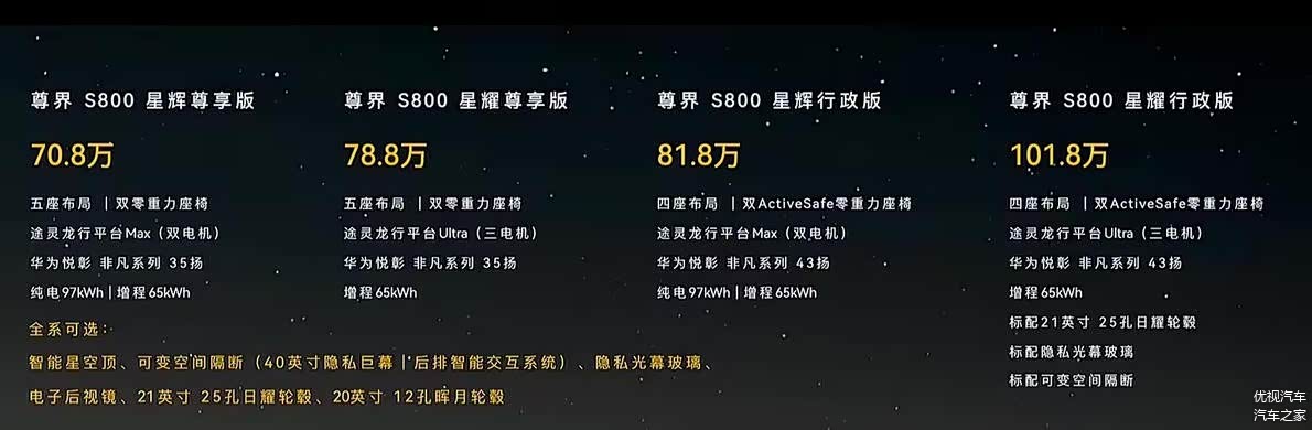动力的话,预计也会像尊界S800一样,将提供纯电车型以及增程动力车型,其中纯电车型搭载双电机,增程式车型提供双电机版本与三电机版本。