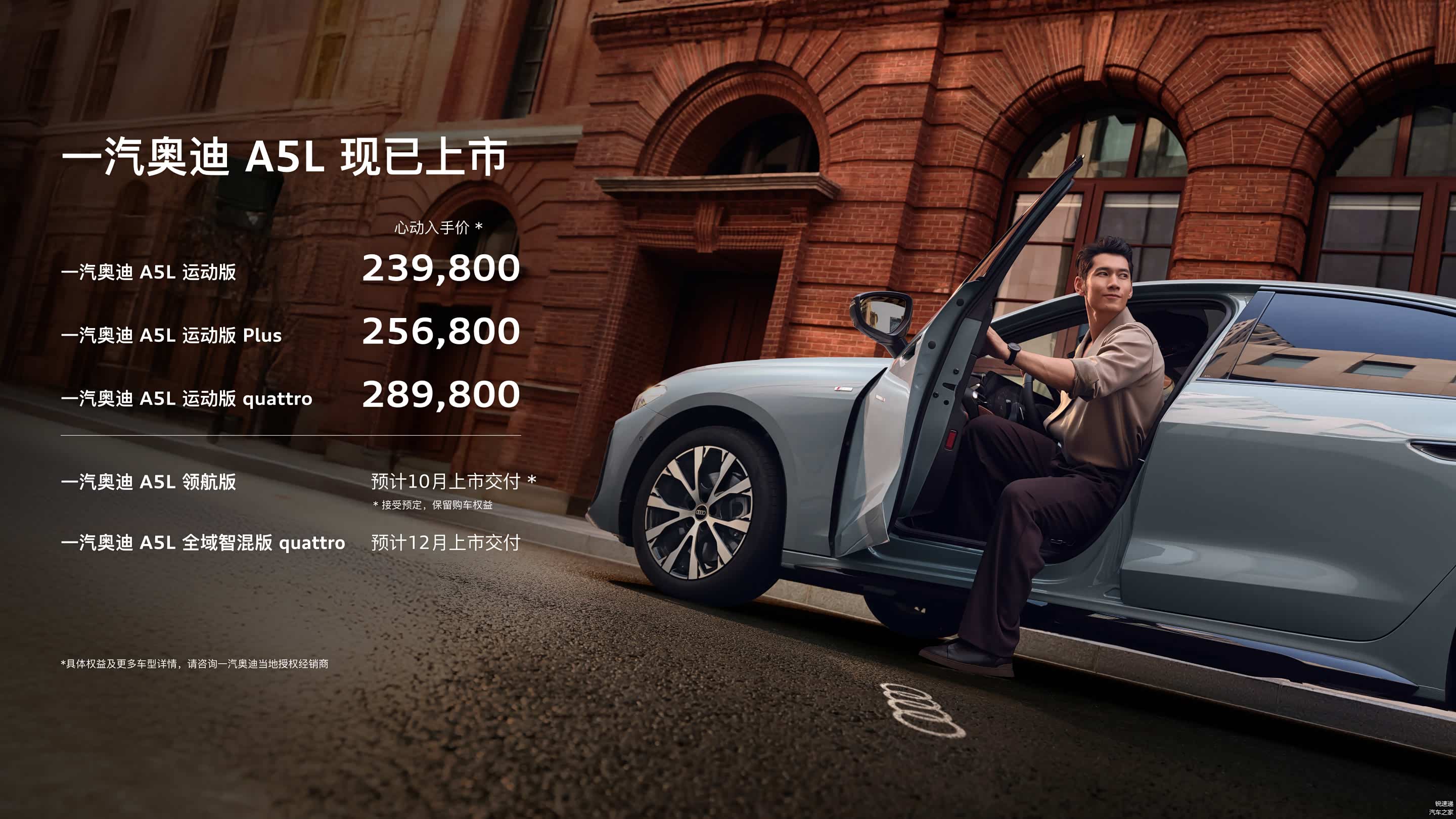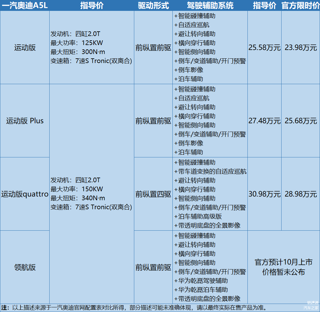 本次上市的一汽奥迪A5L 采用125KW前驱,150KW前驱和四驱,三种动力形式,均配备直列四缸2.0T发动机,配置方面值得注意的是除了传统配置的升级,全新A5L采用多种驾驶辅助方案,其中运动版、运动版Plus标配了自适应巡航、泊车辅助、倒车影像;运动版quattro配置了带车道变换的自适应巡航、泊车辅助高级版、带透明底盘的全景影像;领航版则配备了具有华为乾崑技术的驾驶辅助和泊车辅助系统、带透明底盘的全景影像(详见本文官方配置表附图)。