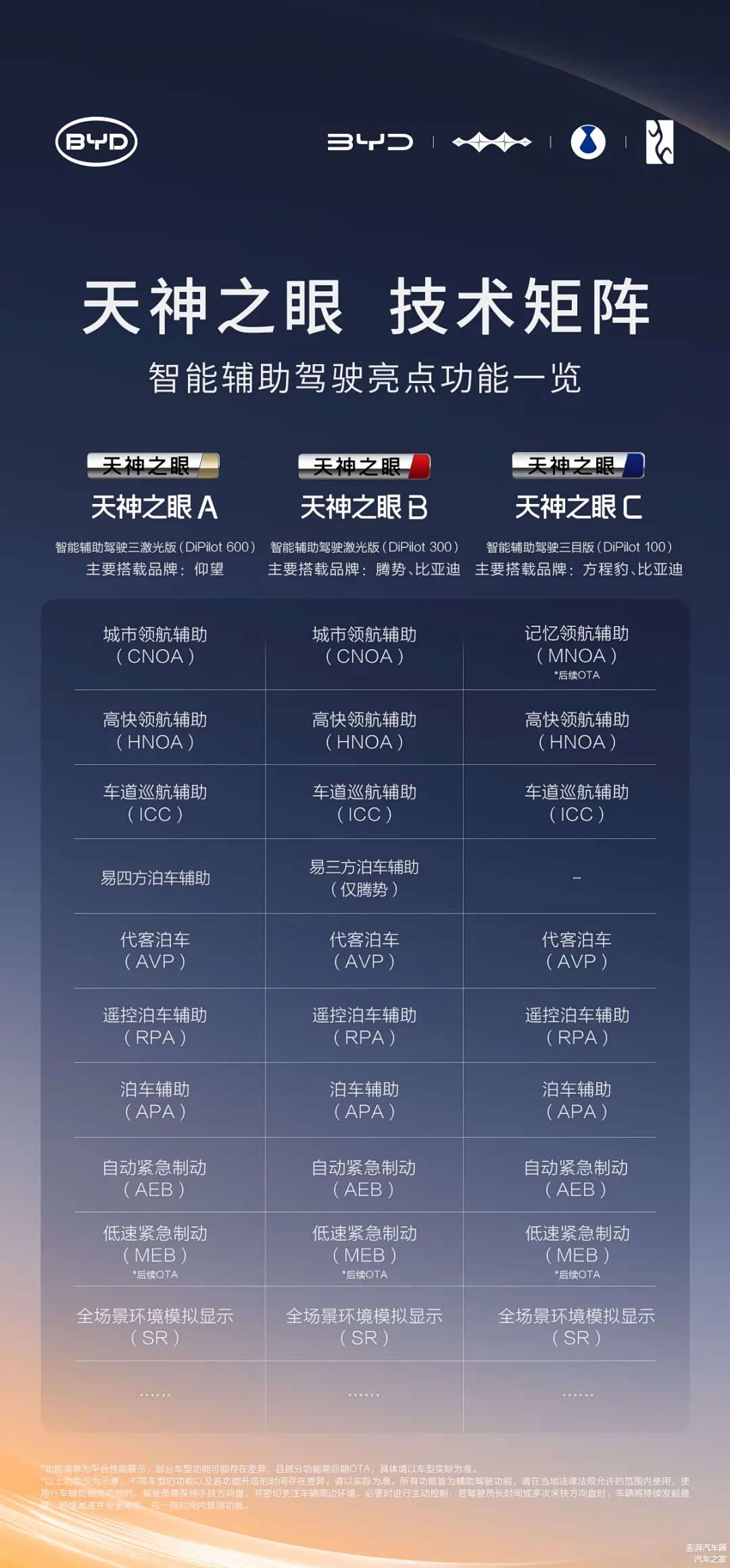 与此同时,比亚迪即将进行天神之眼史上最大规模的智能辅助驾驶OTA升级。本次升级全面覆盖泊车、行车、安全三大板块十余项功能,涉及天神之眼A/B/C三大平台多款车型。在泊车方面,新增三速泊车、车头泊入、偏置泊车、窄车位泊车自动收后视镜等功能,还优化了悬空障碍物识别功能,让智能泊车更快捷、精准且安全;行车方面,可覆盖环岛通行、复杂场景连续绕行、高速施工路段借应急车道绕行、窄路多把掉头等更多场景,还新增前车加塞场景下的闪灯鸣笛提醒功能;安全方面,AEB功能能更轻松识别低矮障碍物,在夜间80km/h情况下可实现对两轮车侵入车道紧急刹停,120km/h触发AEB时能做到两段式舒适刹停,为用户带来更安全舒适的用车体验。