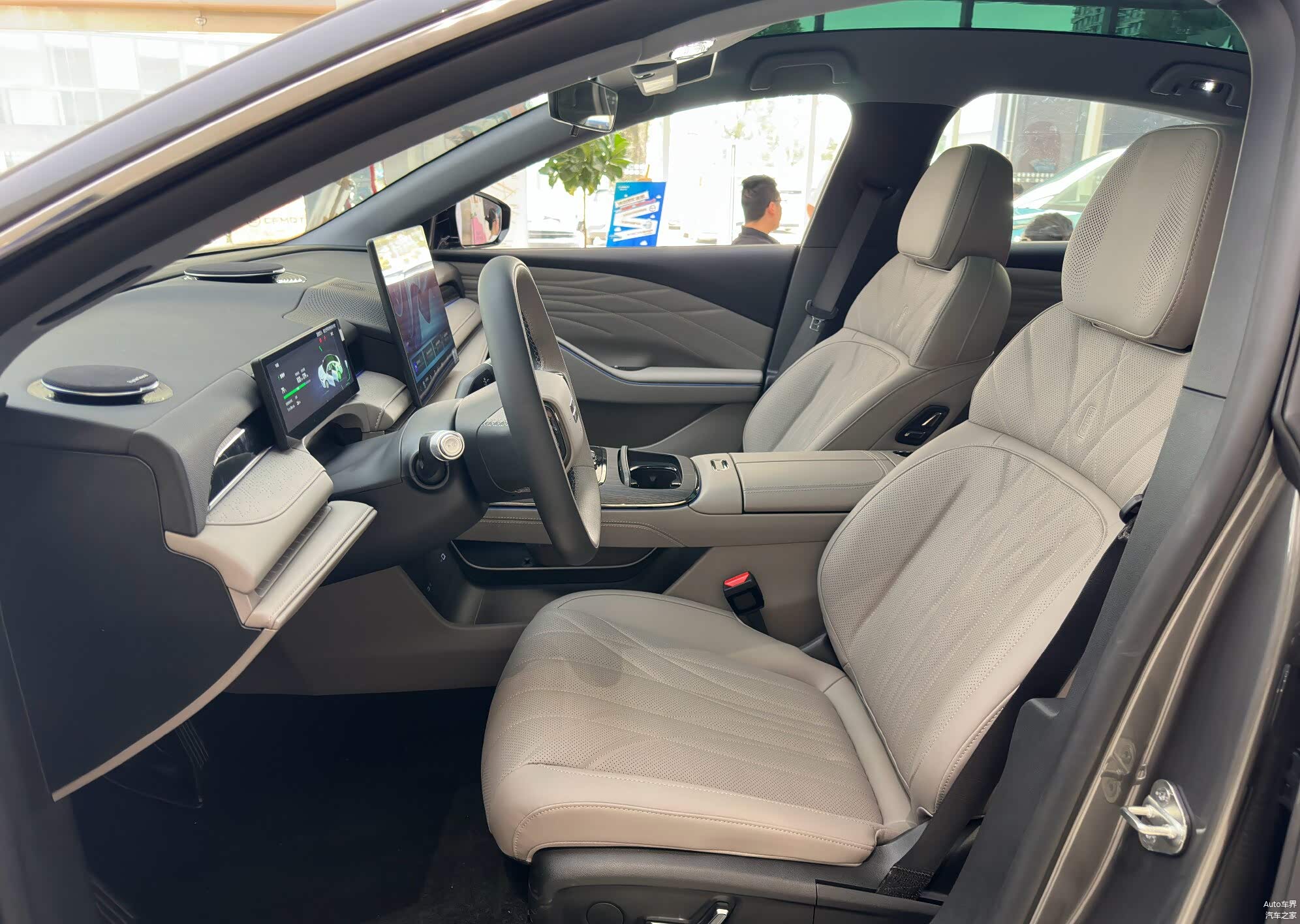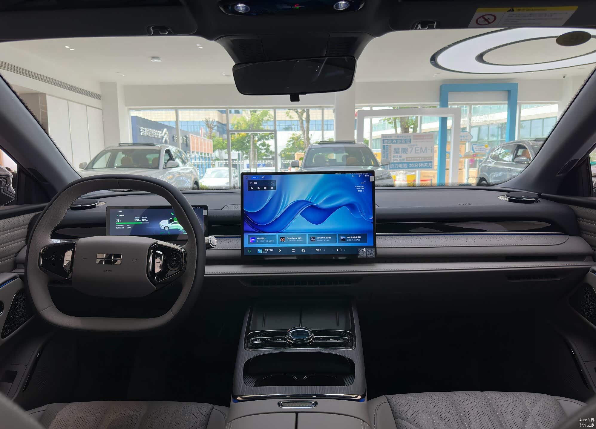 内饰设计的改动则比较明显,虽然座椅外观、门板、方向盘、仪表台框架的造型与银河E8保持一致,但仪表、中控的布局从长条大连屏改成了当下主流且更实用的分体液晶仪表 + 中控大屏的组合,我个人对这种改动非常赞同。