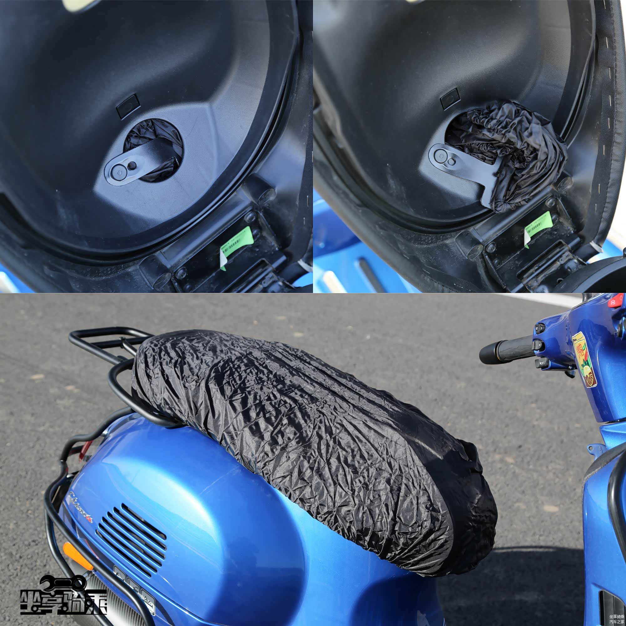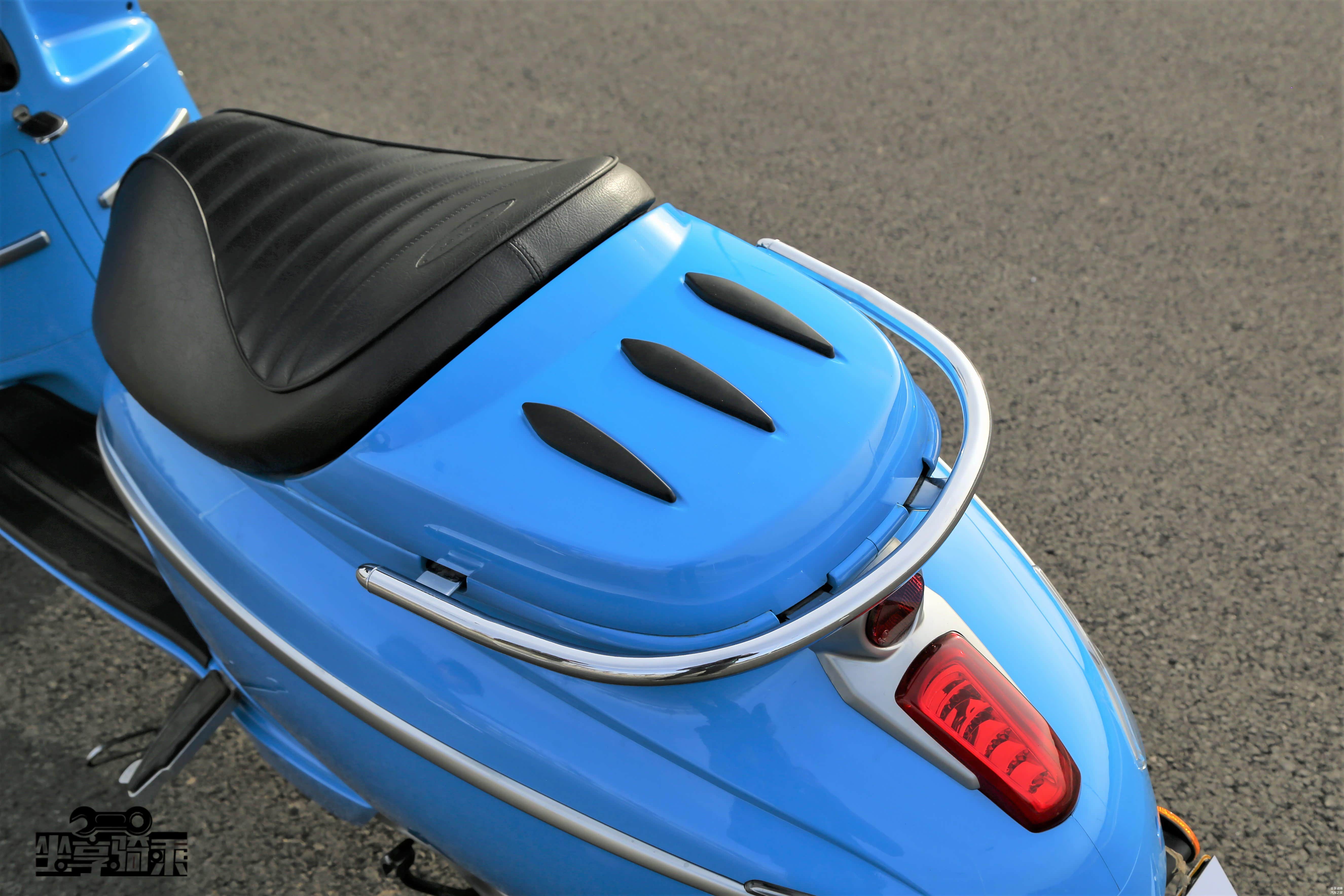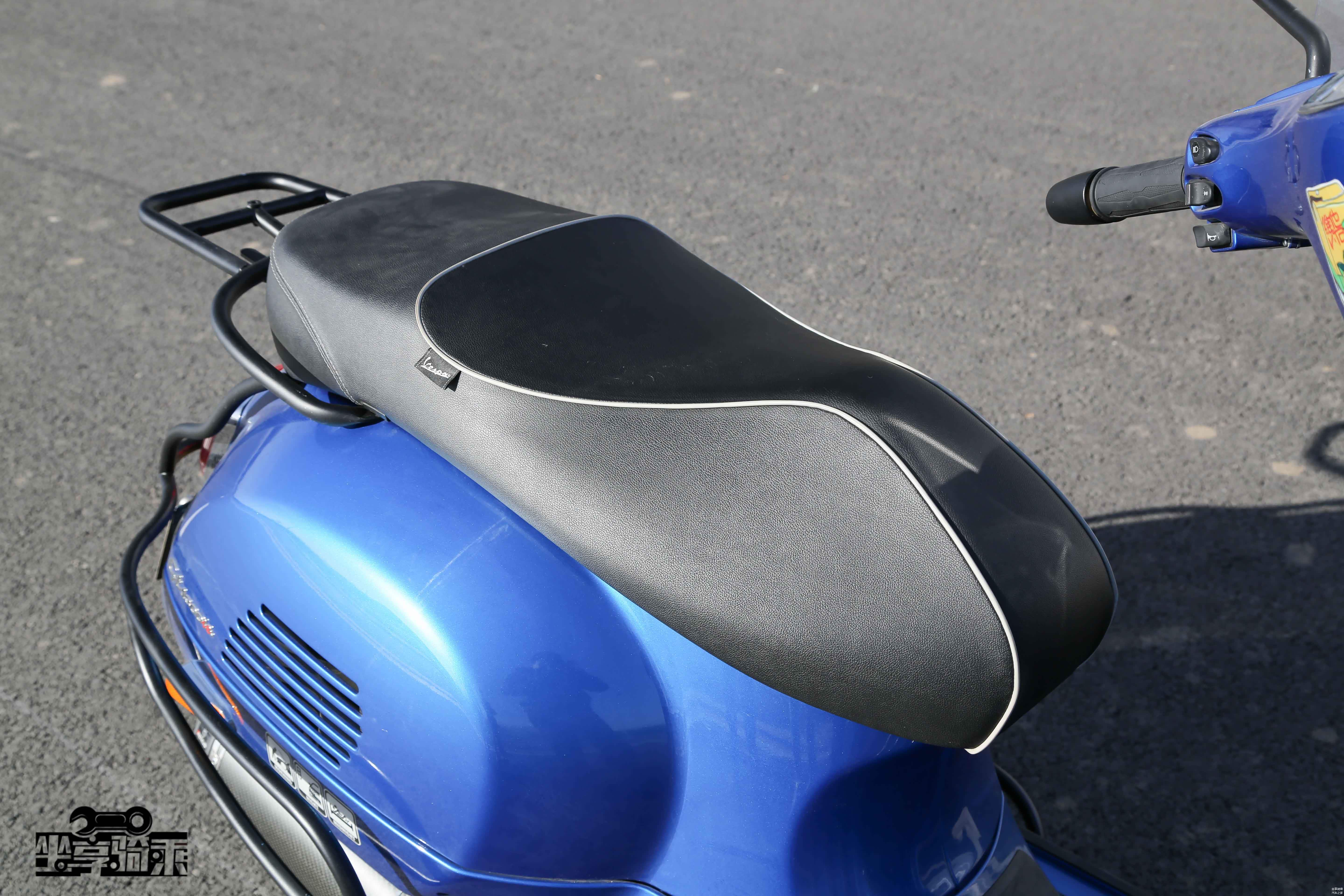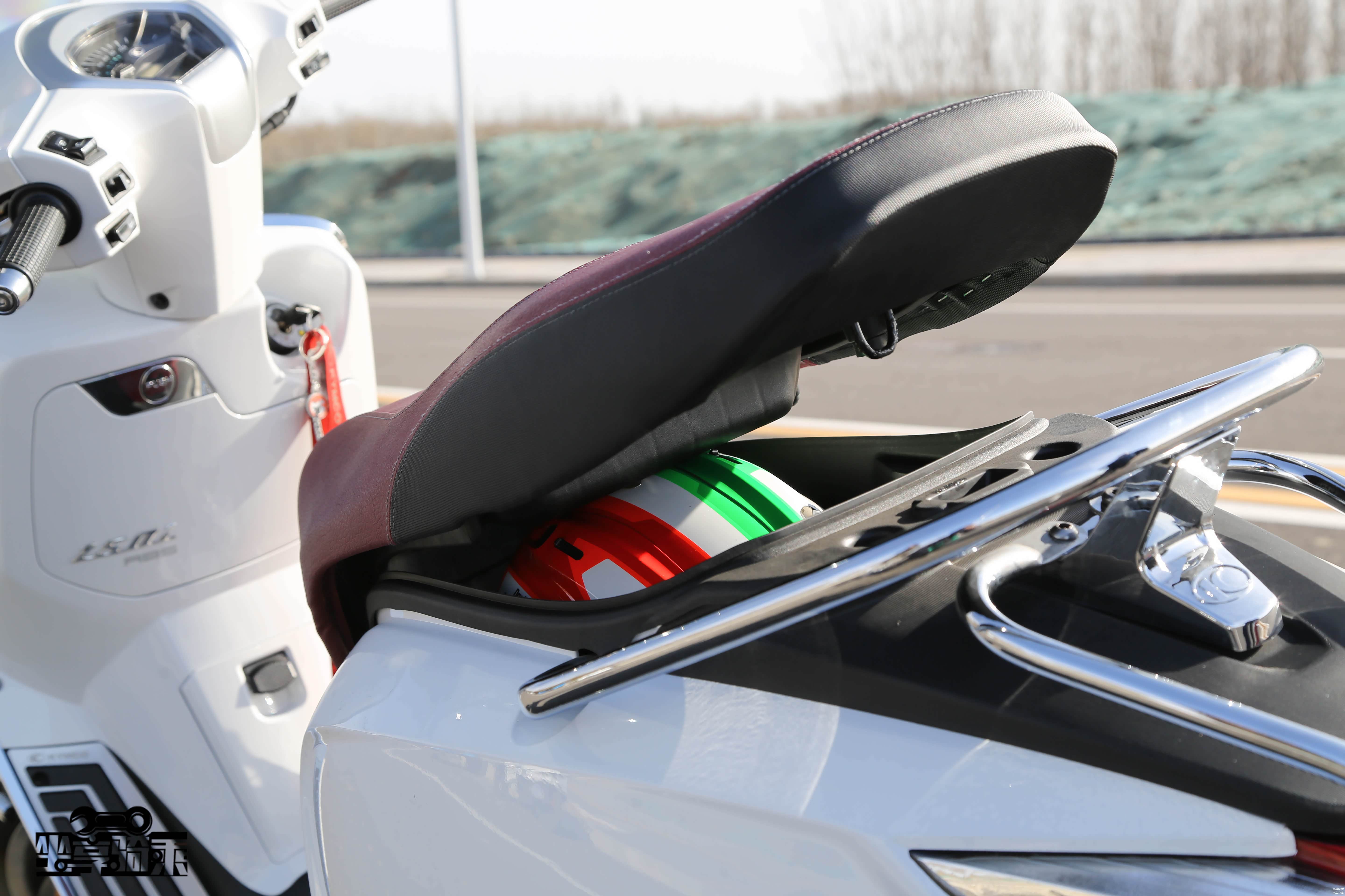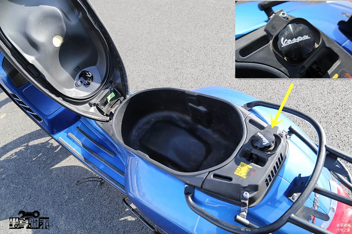 座桶空间可容纳一顶半盔,后方为容积9.5L的油箱,油箱盖上的Vespa Logo十分精美。