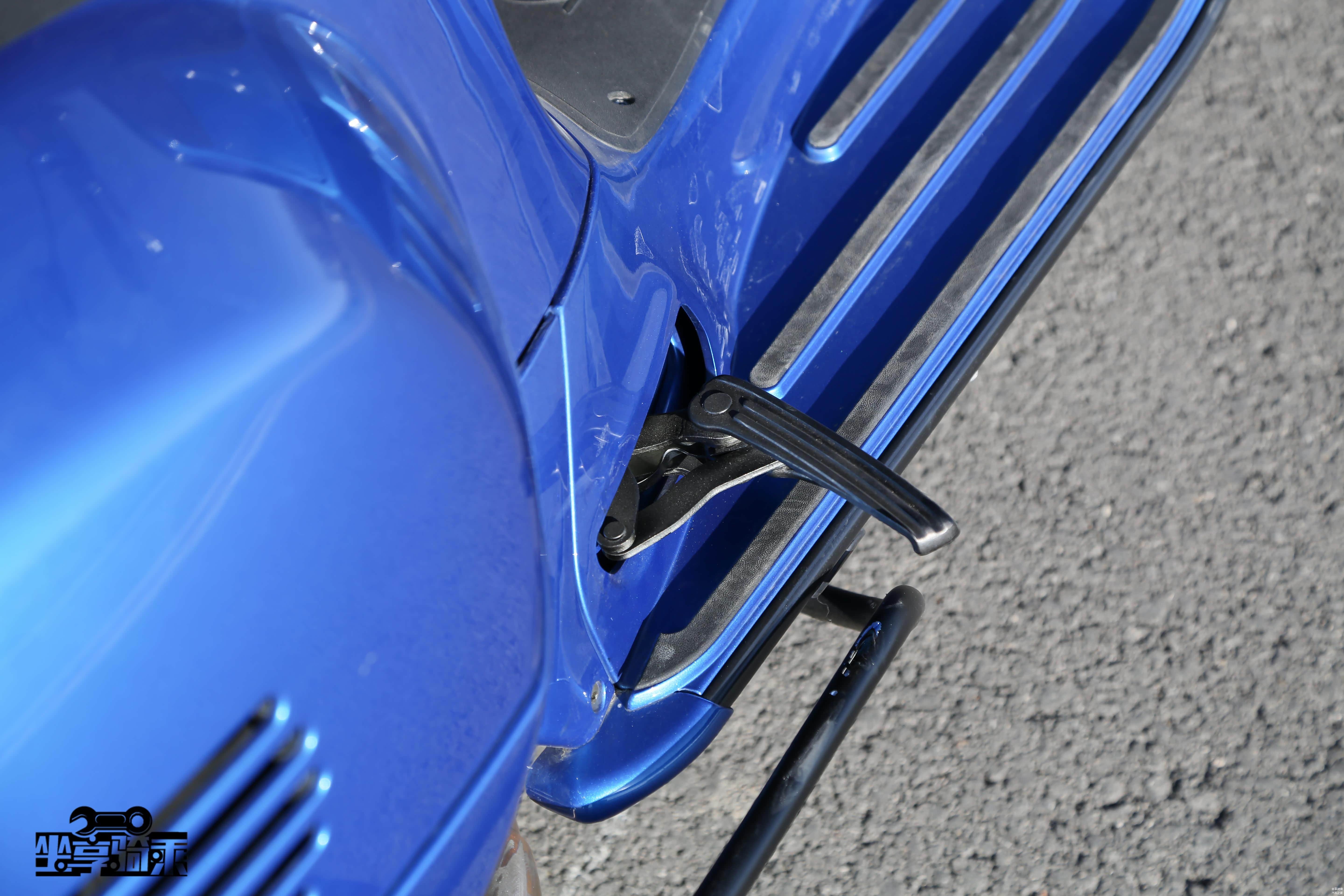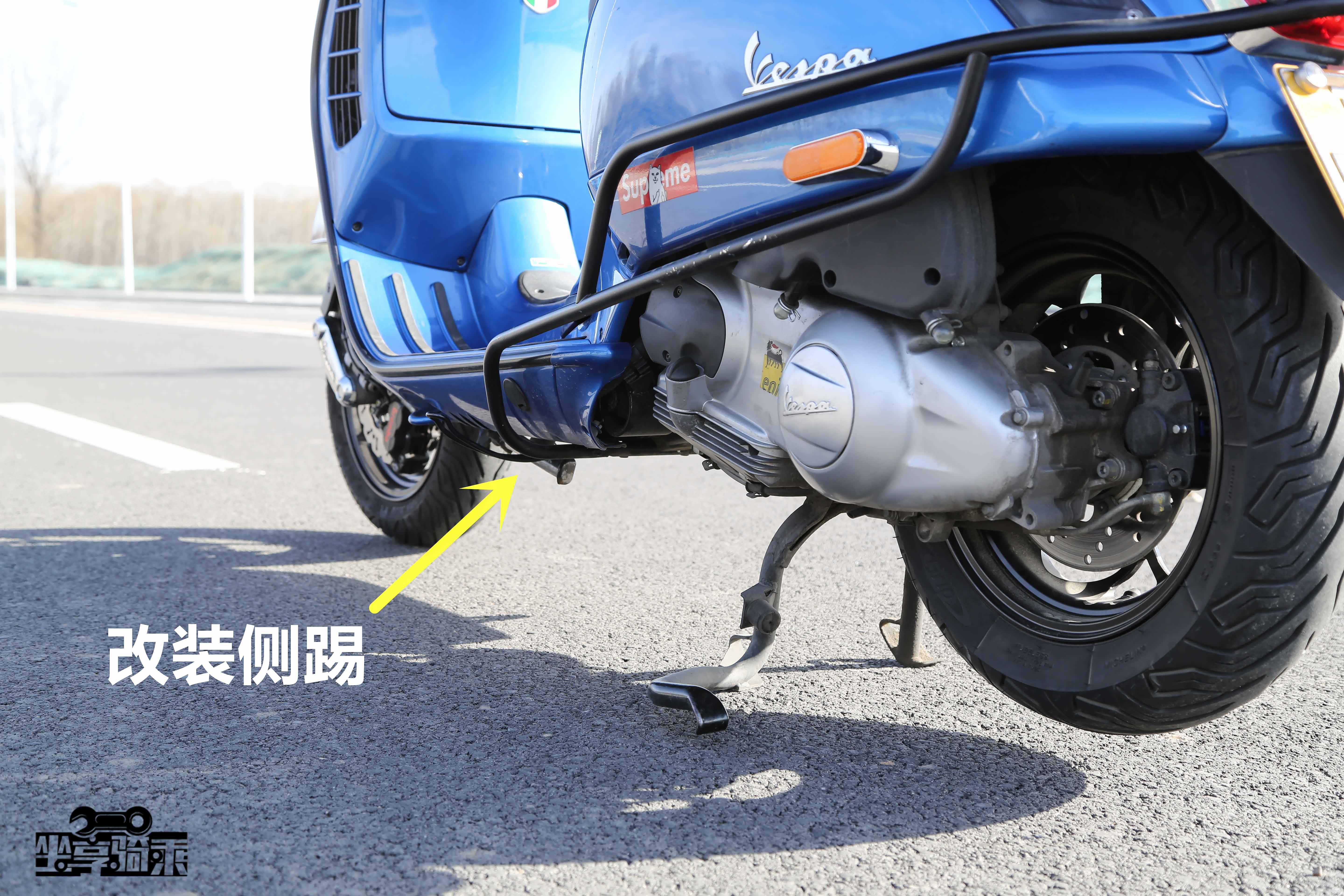 Vespa300原厂没有配备侧支,测试车后期加装了Sip侧支。侧支自动回弹且没有限位功能,使用起来极为不便。