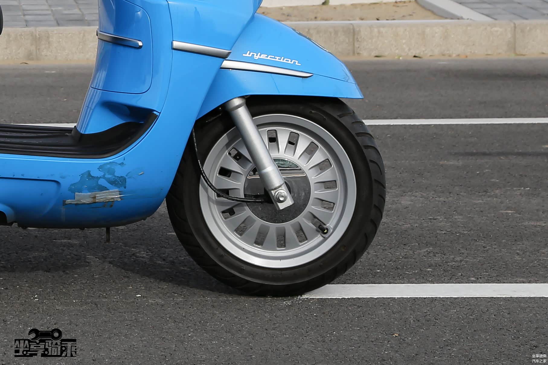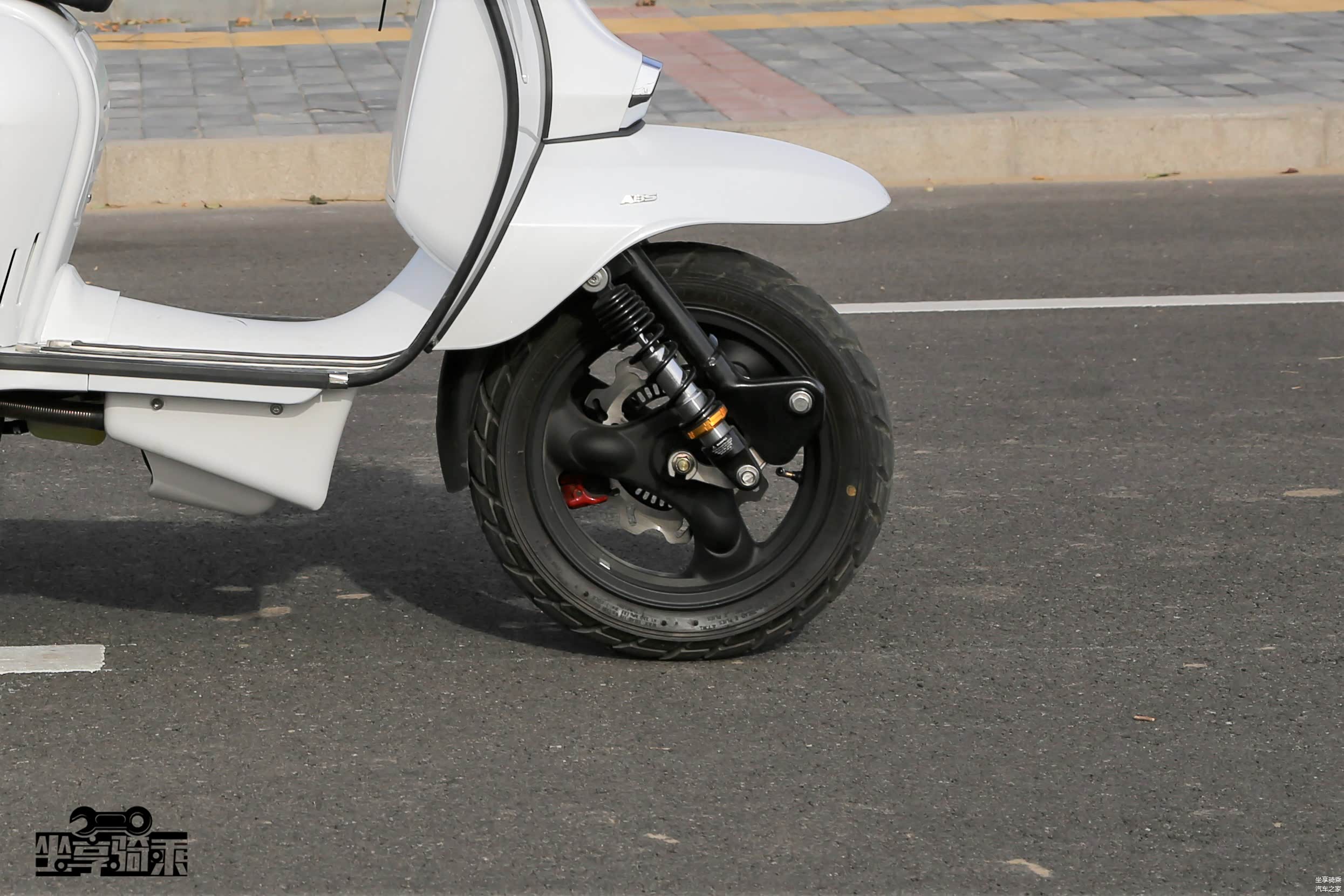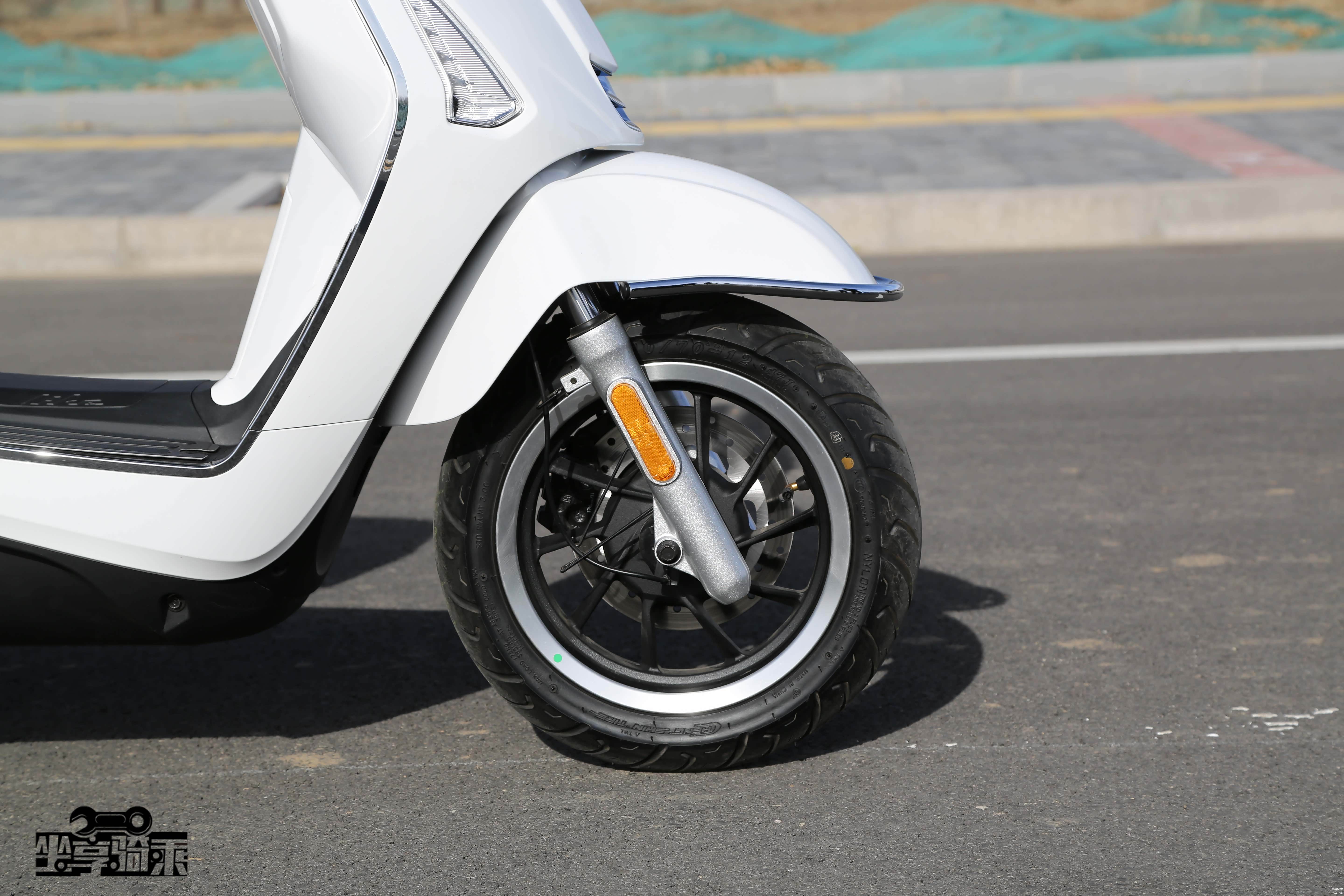Vespa300前悬挂与150结构相同,轮圈为改装产品。标配前后ABS系统。测试车辆改装了前后RPM可调减震。