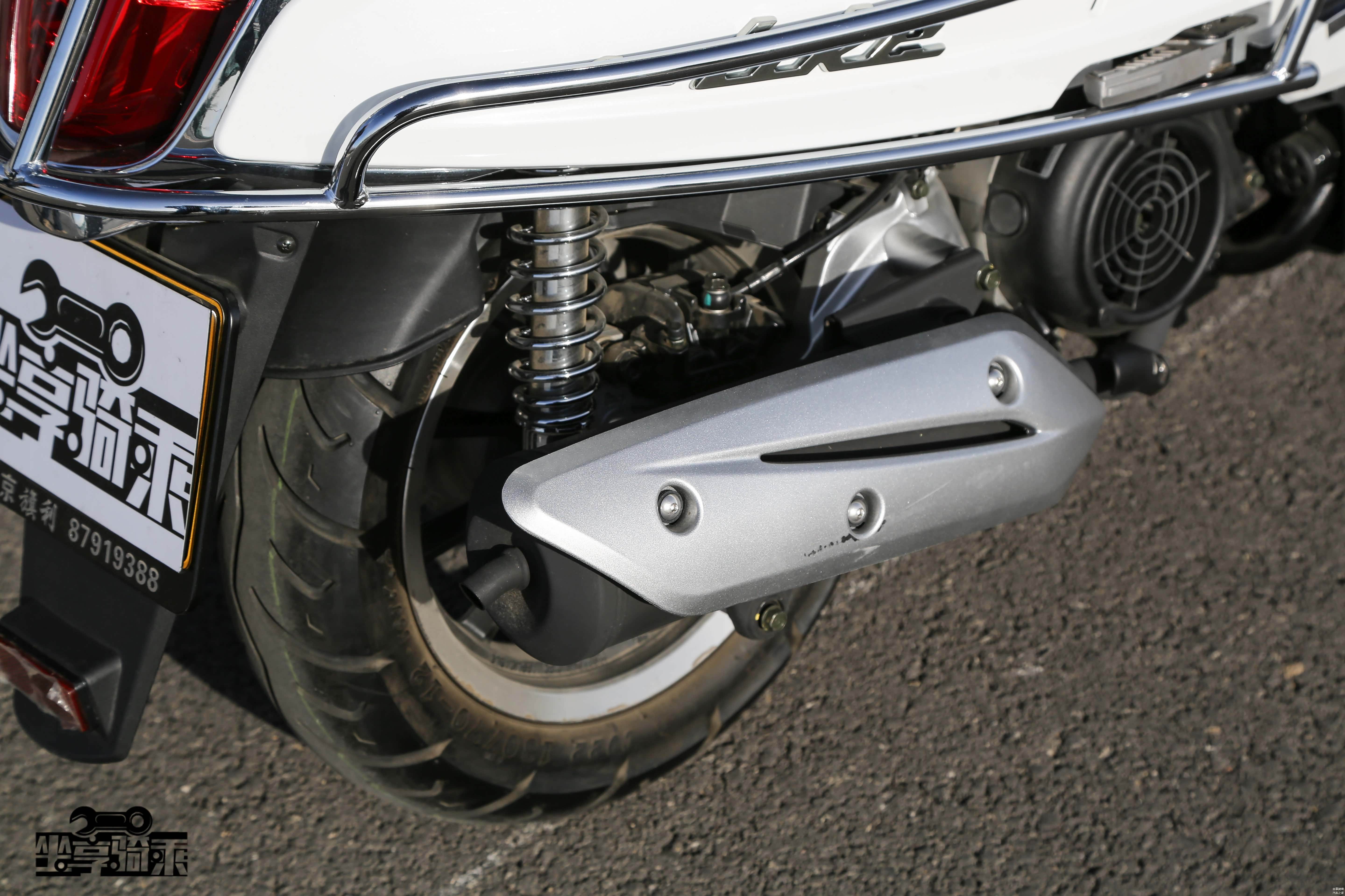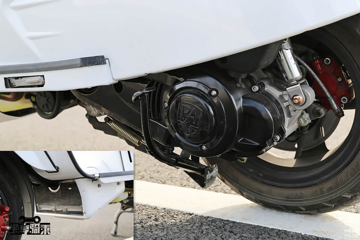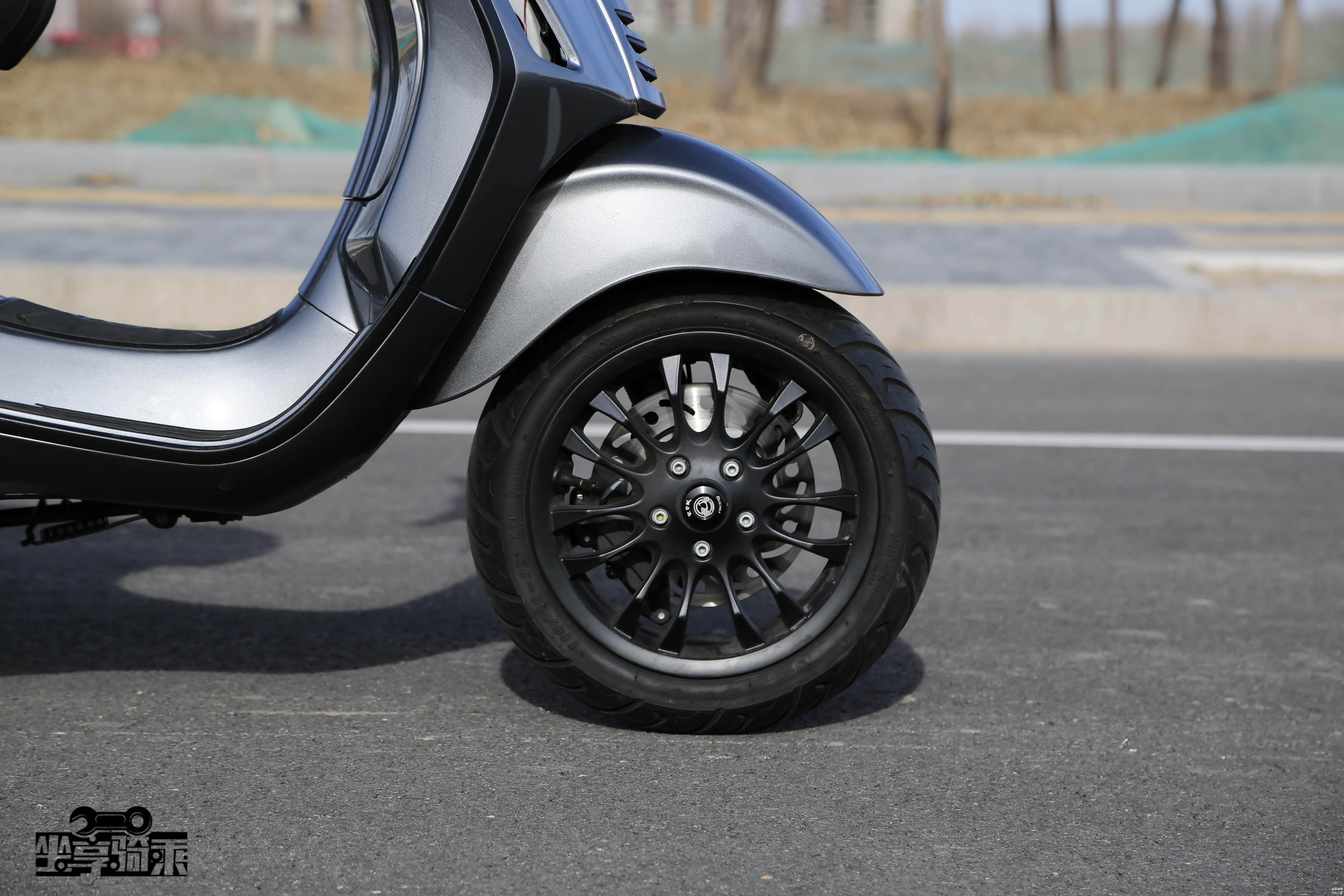 测试车辆改装了天蝎尾段排气。Vespa150后轮为鼓刹,没有ABS系统。后轮胎宽度为120mm。