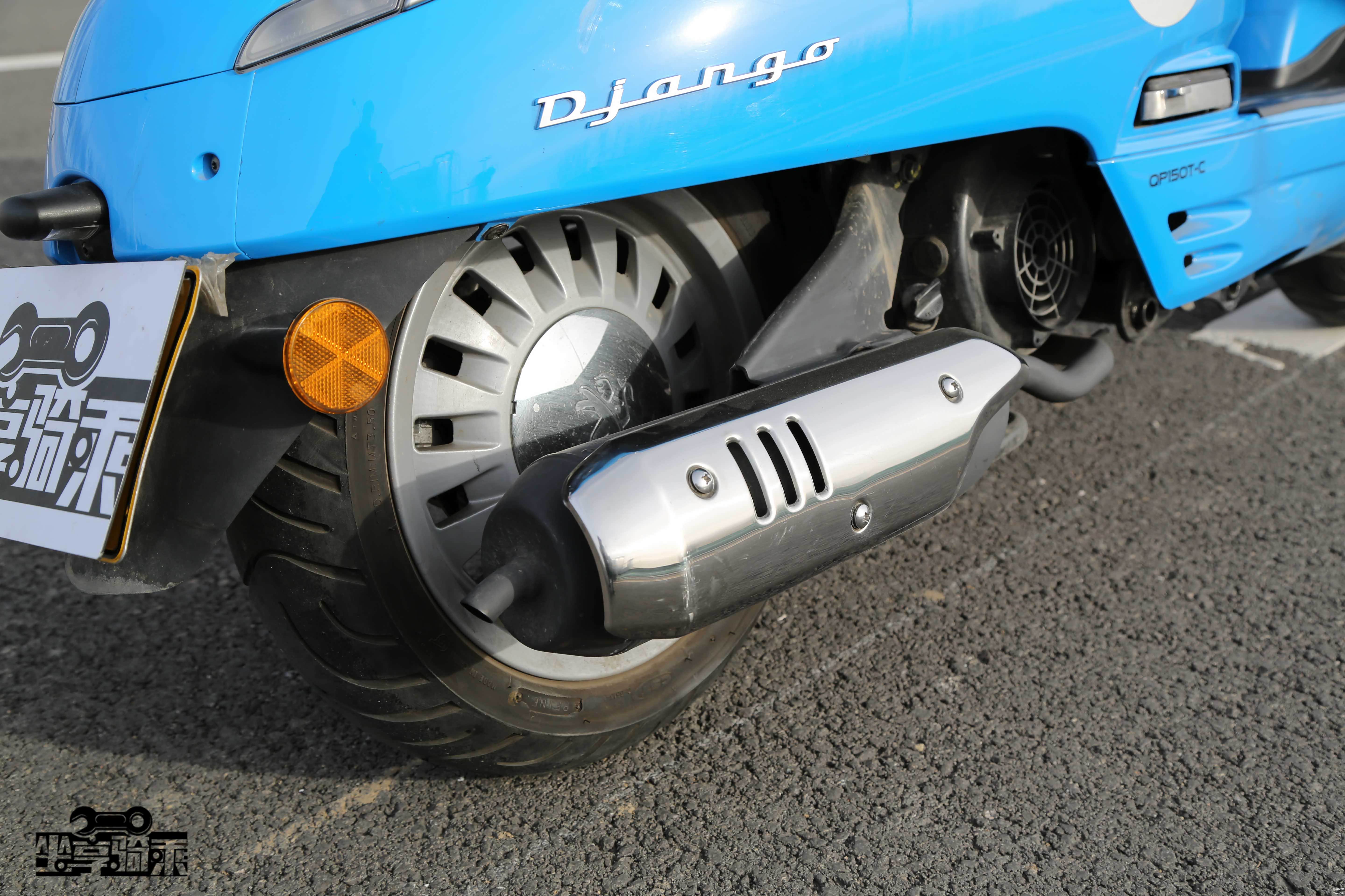 姜戈采用正置前叉,轮圈造型十分复古,12寸轮圈。六辆车中,只有姜戈和Vespa300前轮胎宽度达到了120mm。除售价最低的经典版以外,均搭载SBC联动刹车系统。姜戈是六辆车中唯一一款没有配备ABS系统的踏板车。
