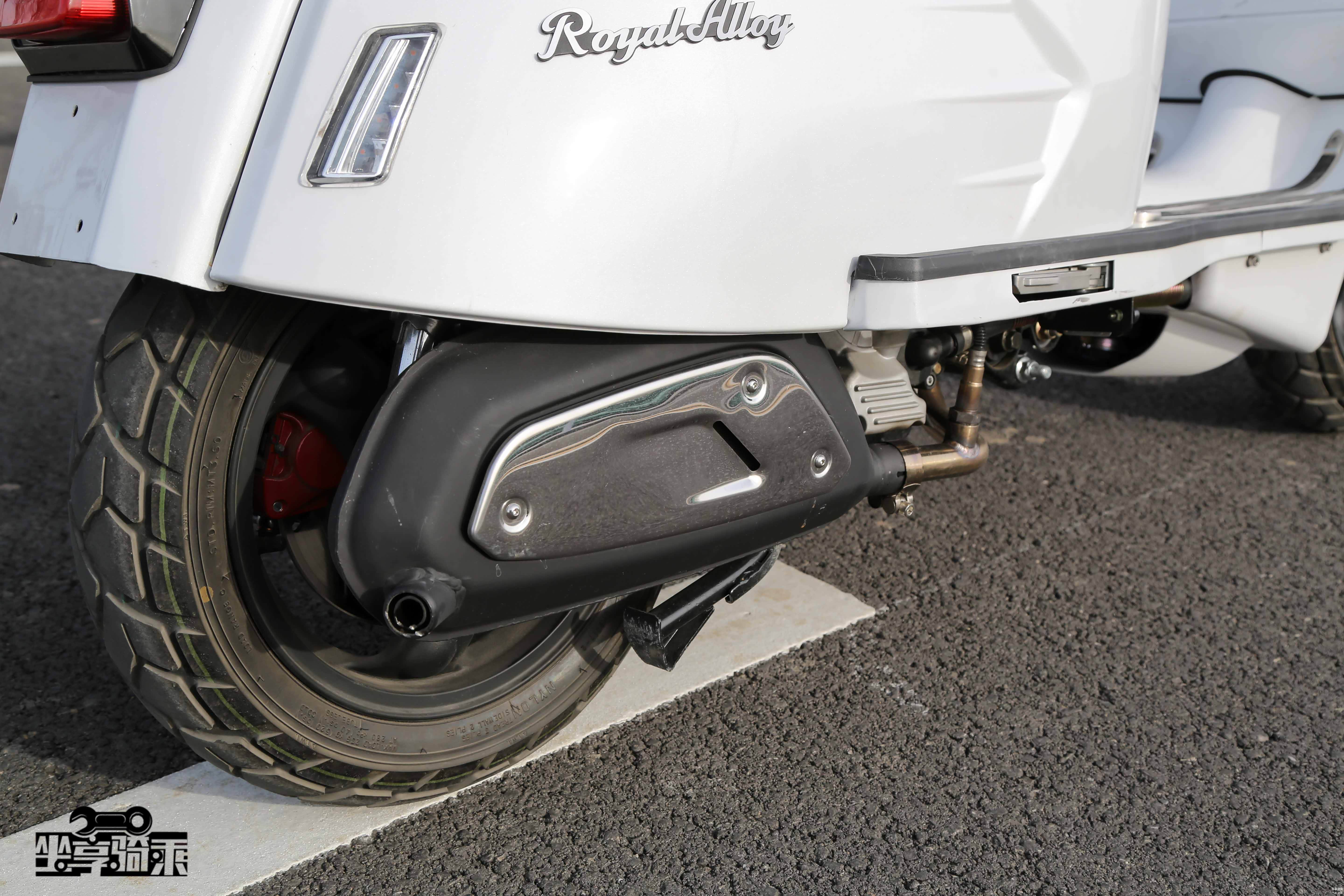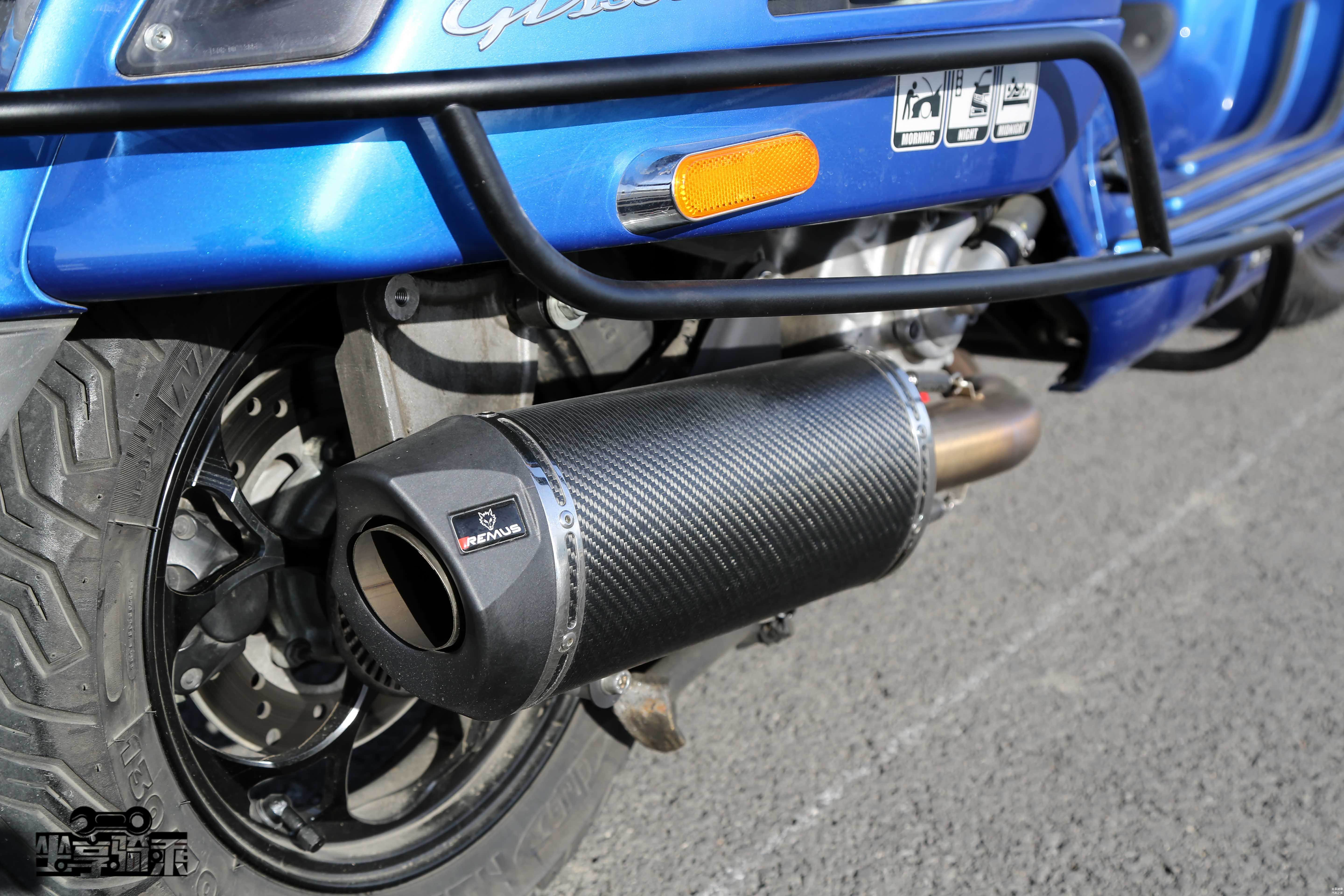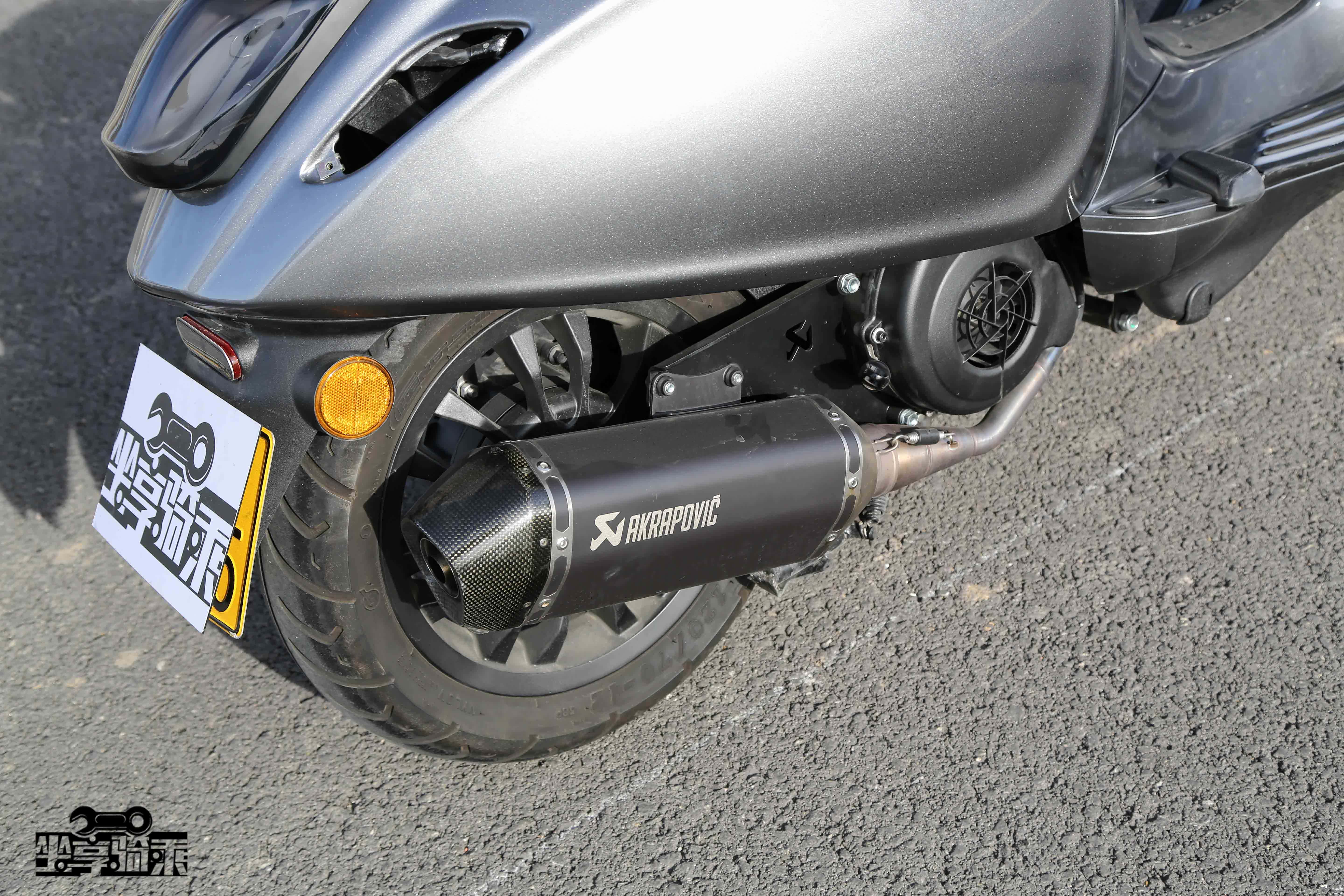 Vespa300后轮为碟刹。测试车改装了Remus狼头排气尾段。