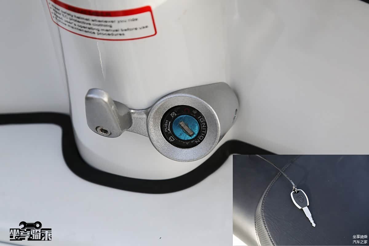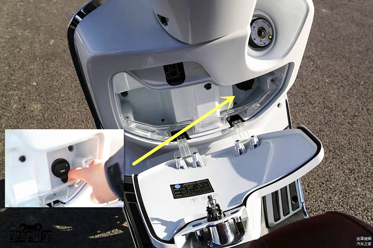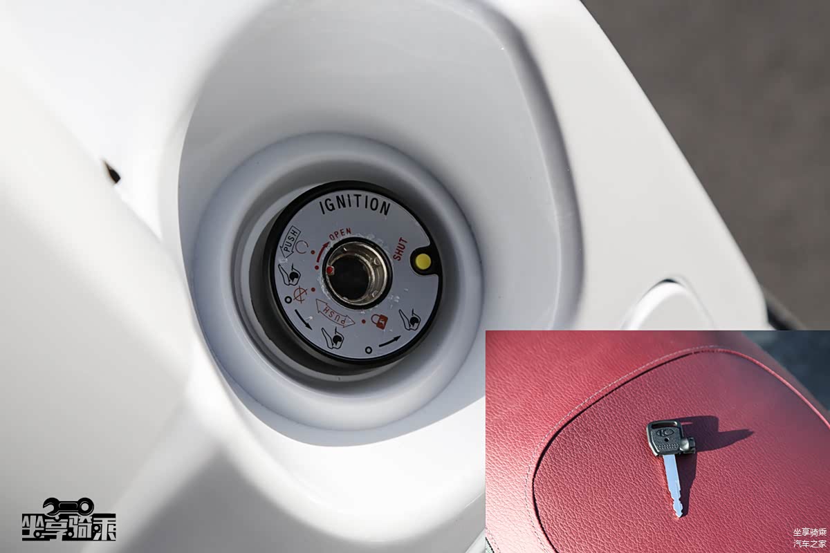 受日系踏板摩托车影响,Like150配备了类似的钥匙门锁闭功能。按住钥匙门旁边的黄色按键即可将其锁闭,通过钥匙侧面旋转开启。为车辆再添一道保险措施,但笔者一直对这种防盗措施的实际效果表示怀疑,反而开启时颇为麻烦。前储物空间非常大,按下储物格上的按钮即可开启,直接配备可充电的USB接口,免去了点烟器接口二次转接。