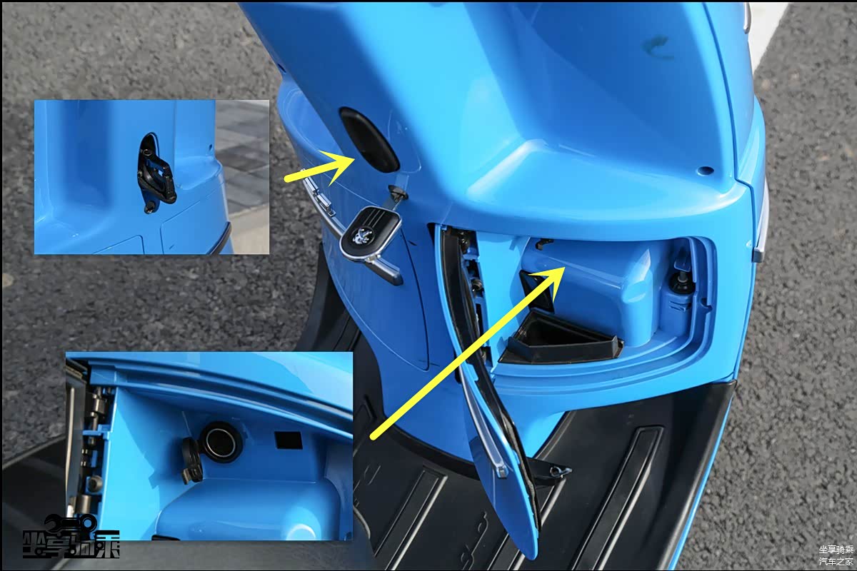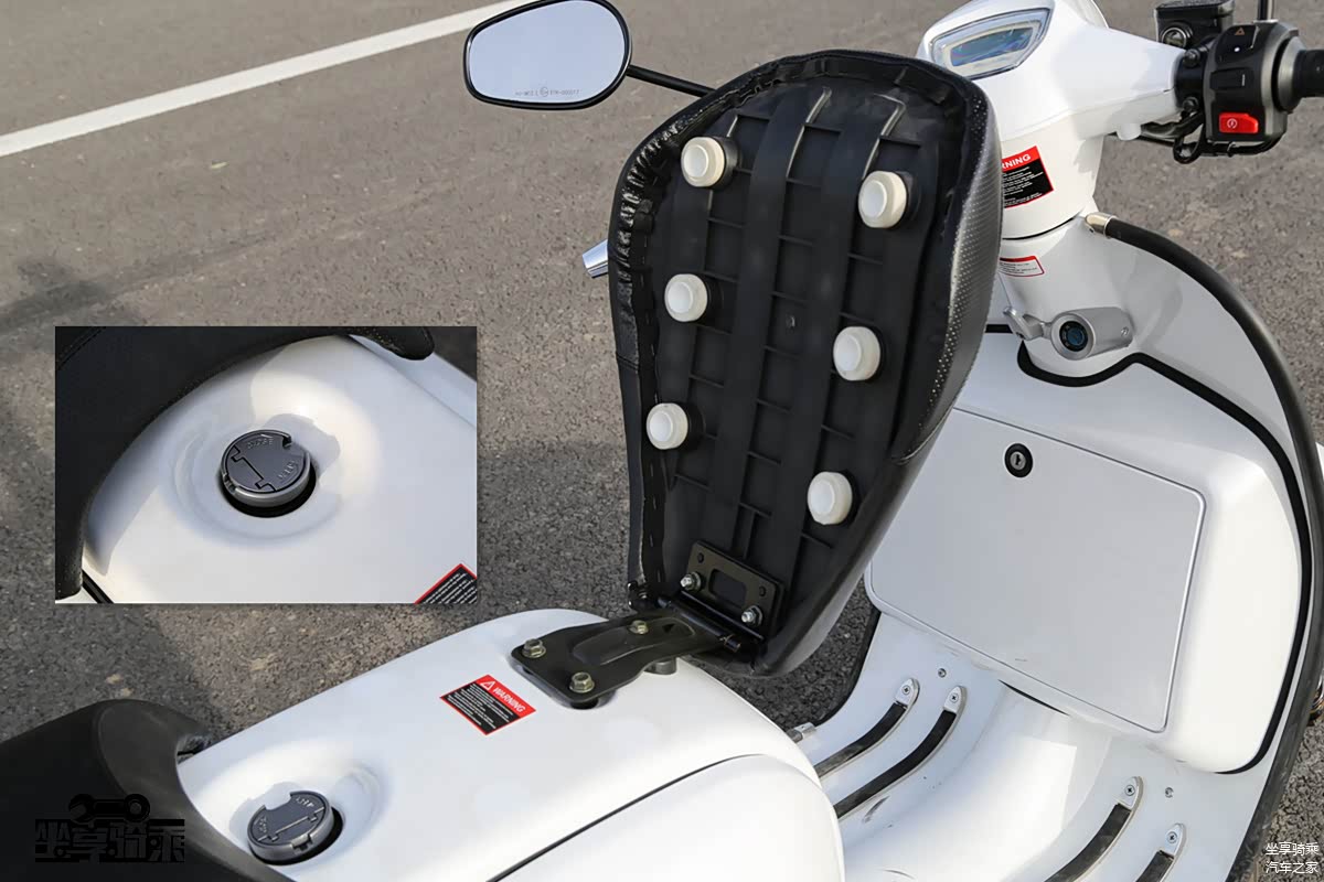 Like150的电瓶布置在座桶后方,打开塑料盖板便可露出电瓶正负极,方便搭电,小细节非常贴心。