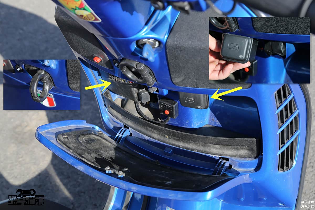 得益于增长的体型,Vespa300的储物空间相比150有明显进步,测试车将手把加热控制器安装在这里,隐蔽且不影响美观。随车工具也被布置于此。遗憾的是同样没有看到充电接口。