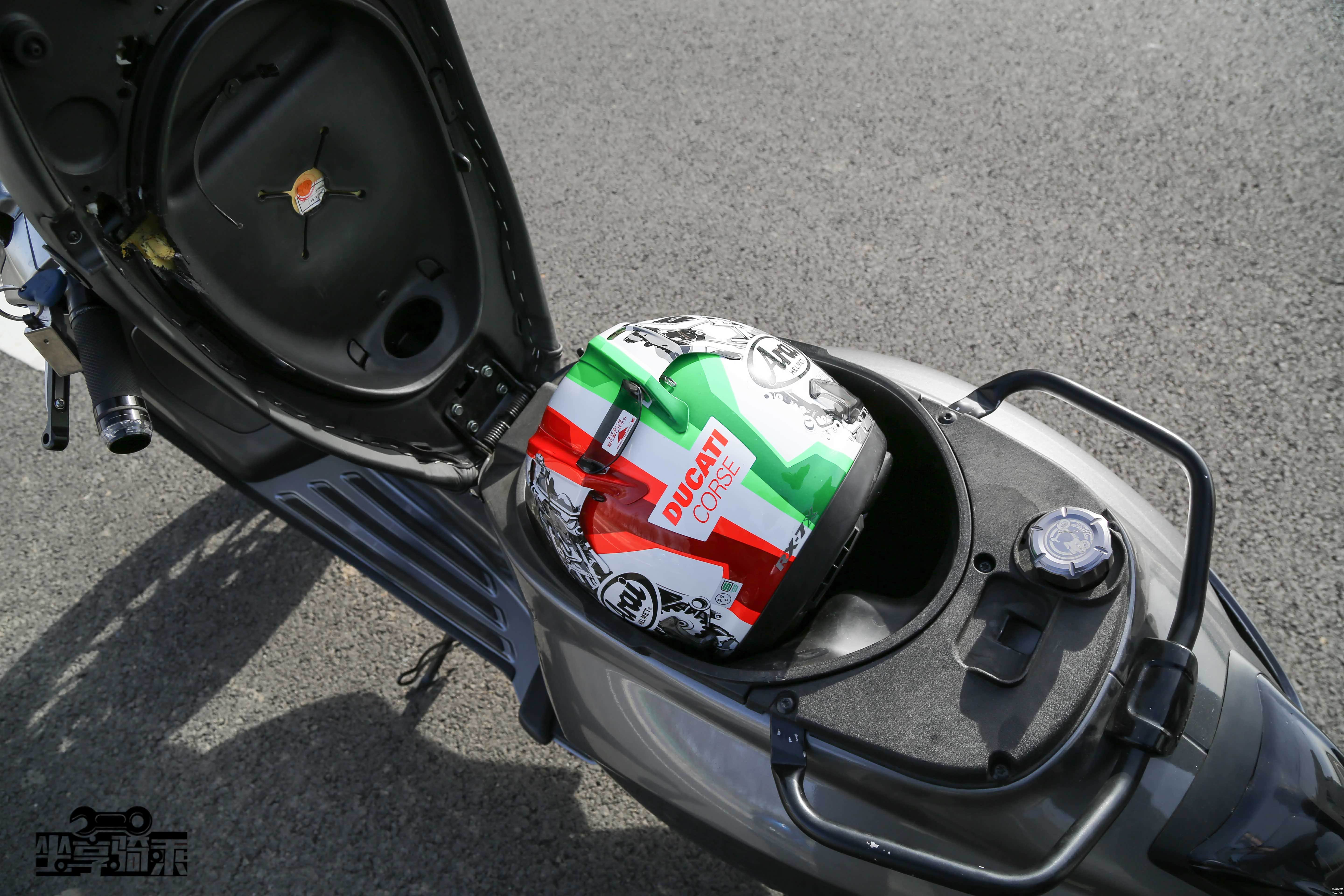 座桶空间是此次测试所有车型中最大的,但仍然无法容纳全盔,半盔完全没有问题。