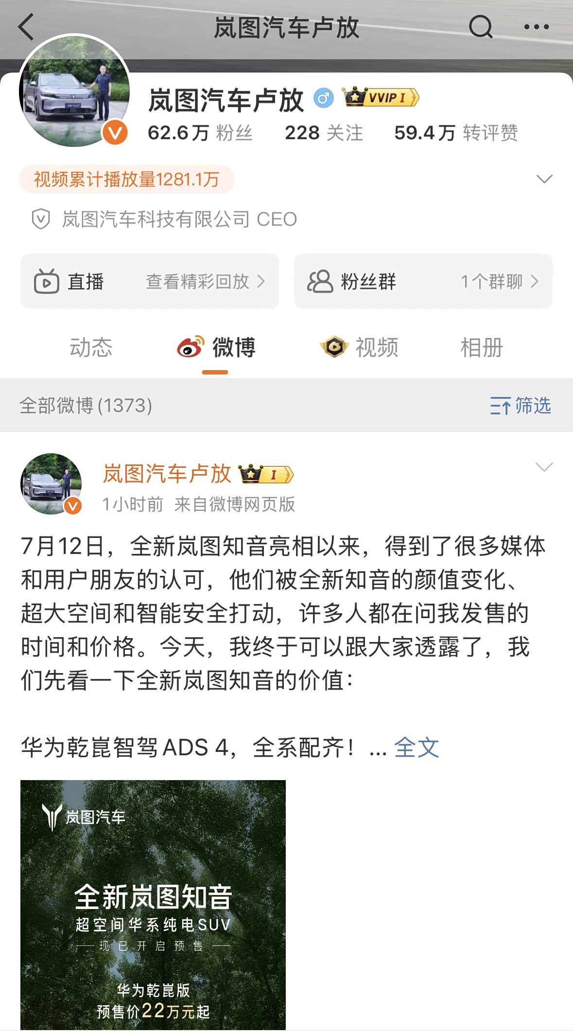 8月13日,岚图汽车CEO卢放通过个人微博发布全新 岚图知音(图片 | 参数 | 询价)预售信息,宣布全新岚图知音正式开启预售,预售价22万元起。据了解,全新岚图知音将于8月底正式上市。