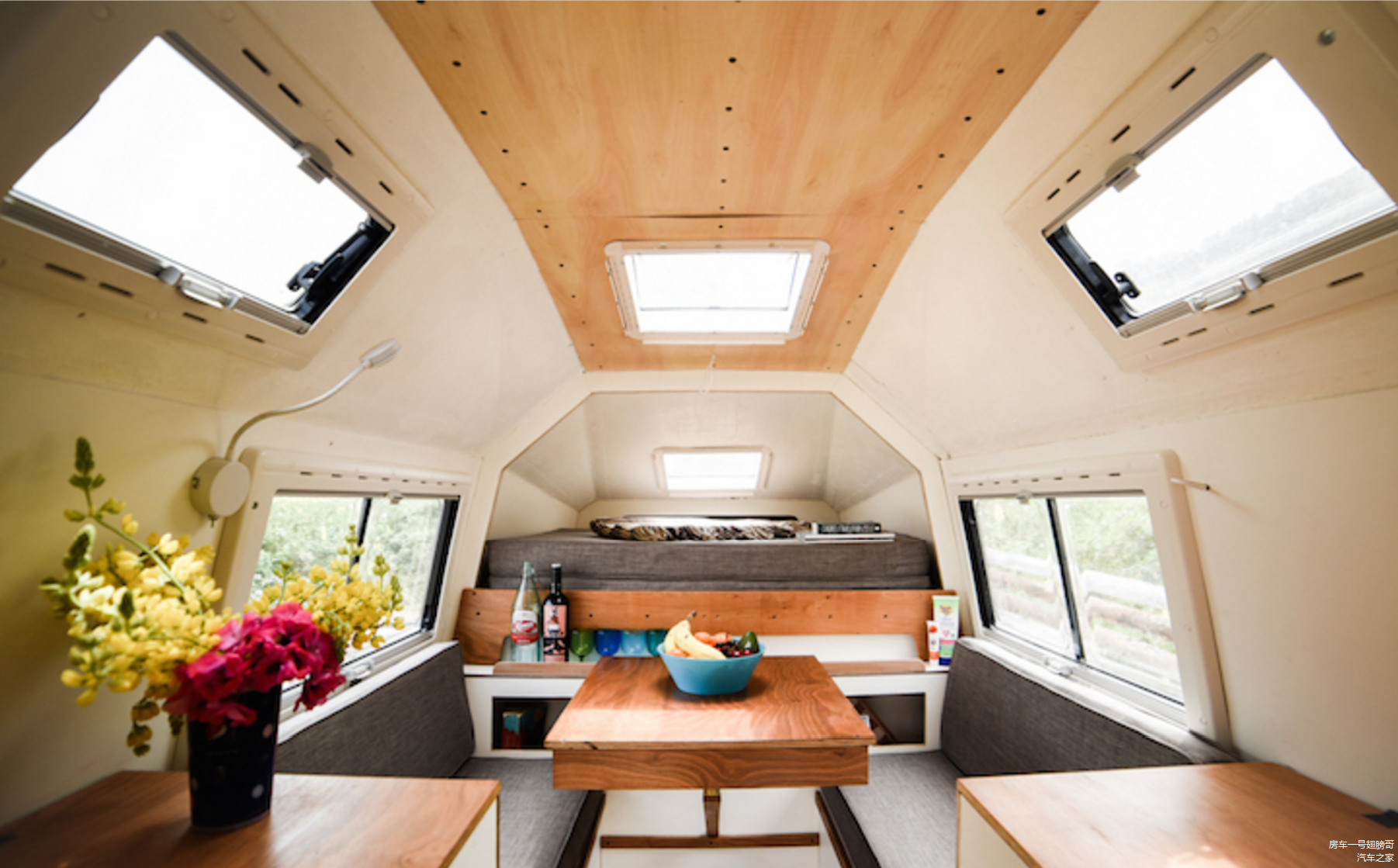 下面是内部图,可以看出,作为一款房车,他的床,桌子,沙发,厨房等各项基本功能都有,非常适合2~3口人出门旅行,只是在前面的床的位置,可能会低了一点,起床时坐起来可能会碰头吧,这个外观也许很好的借鉴了南美长鼻小浣熊的头部造型,但是这样的外观你会喜欢吗?