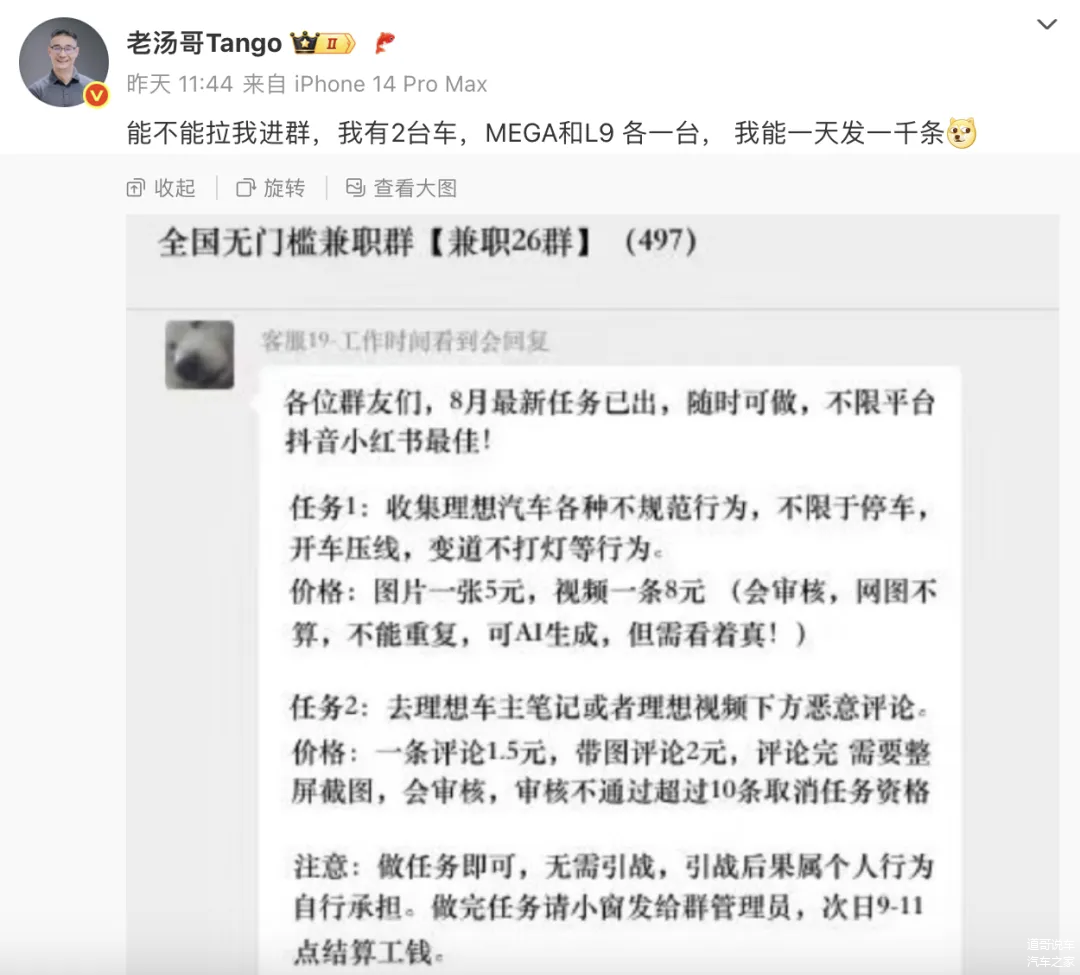 理想汽车产品负责人汤靖曾晒出一张网络水军组织抹黑理想汽车的兼职群聊天截图,图上显示,兼职人员主要有两个任务:其一为收集理想汽车各种不规范行为,不限于停车、开车压线、变道不打灯等,价格为图片一张5元,视频一条8元(会审核,网图不算,不能重复,可AI生成,但需看着真);其二为去理想车主笔记或者理想视频下方恶意评论,价格为一条评论1.5元,带图评论2元(评论完需要整屏截图,会审核,审核不通过超过10条取消任务资格)。