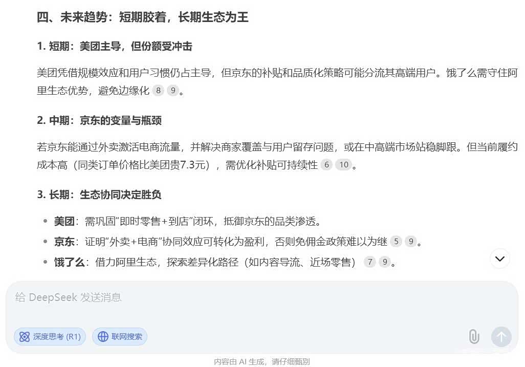 DeepSeek深度思考后给出的分析:美团的规模效应和用户习惯短期内难以撼动,但其盈利模式依赖高佣金和骑手成本压缩。若京东能通过高频外卖激活电商生态,并解决商家覆盖与用户留存问题,可能在中高端市场占据一席之地。饿了么则需依托阿里生态,探索差异化路径。