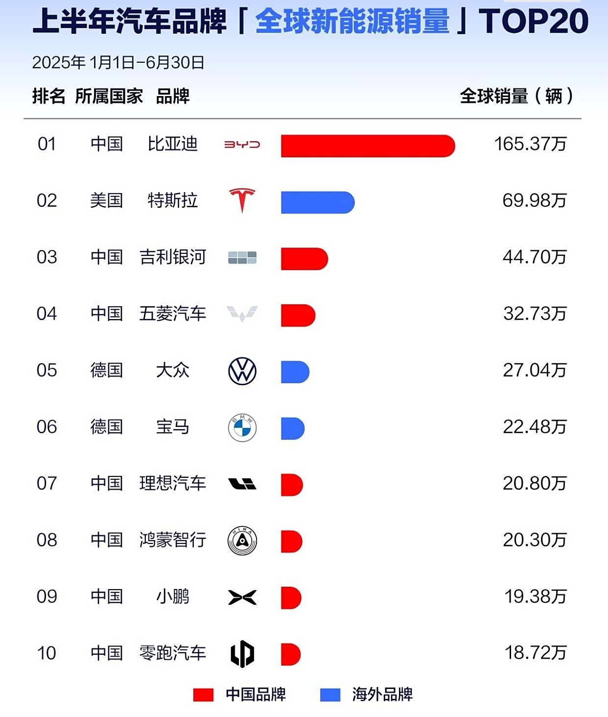 2025上半年全球汽车品牌新能源销量