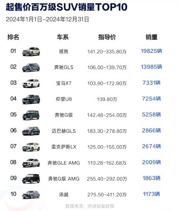 百万元级SUV销量TOP10:进口车9辆,国产车1辆
