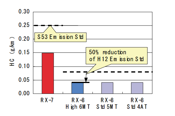 RX-7和RX-8的HC排放对比图(S53是1978年的标准,H12是2000年的标准)