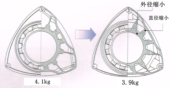 和13B-RE相比,13B-MSP转子重量降低5%,飞轮重量降低15%。增强了偏心轴的抗变形性。