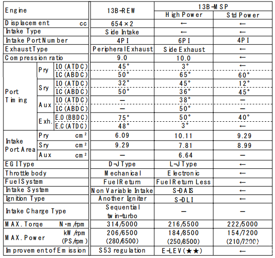 通过将排气口设置在侧壁,改善菱封的耐磨损度,改进引擎的回转部件和燃料系统,使得13B-MSP能顺畅的攀升到9000转。