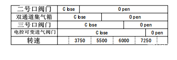 (2)3500-5500转:二号口阀门打开,进气阻力降低,充填效率得以保障。