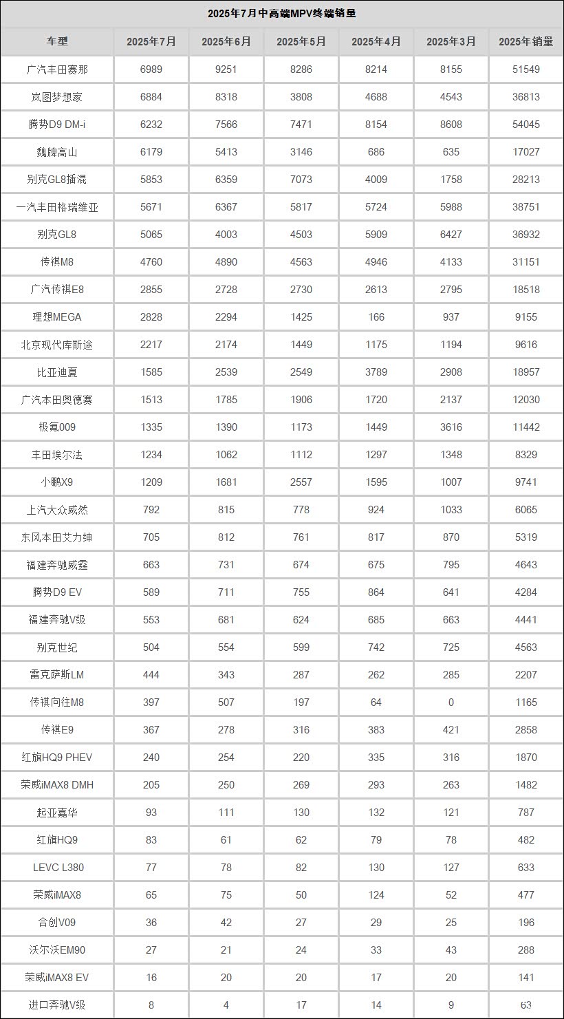 盘点2025年7月的中高端MPV市场,丰田是整体销量的赢家,广汽丰田赛那7月终端销量6989辆,前7个月总销量51549辆;一汽丰田 格瑞维亚(图片 | 参数 | 询价)的7月终端销量为5671辆,前7个月总销量38751辆;迫于市场压力,两款丰田MPV的终端优惠都很大,这确实可以全面提升竞争力。对于那些注重用车成本的家庭用户,丰田混动MPV显然是比纯电或插电混动MPV更好的选择。高端车型方面,埃尔法和雷克萨斯LM的7月终端销量为1234辆和444辆,这两款车也是目前为数不多终端售价可以高于厂商指导价的车型。