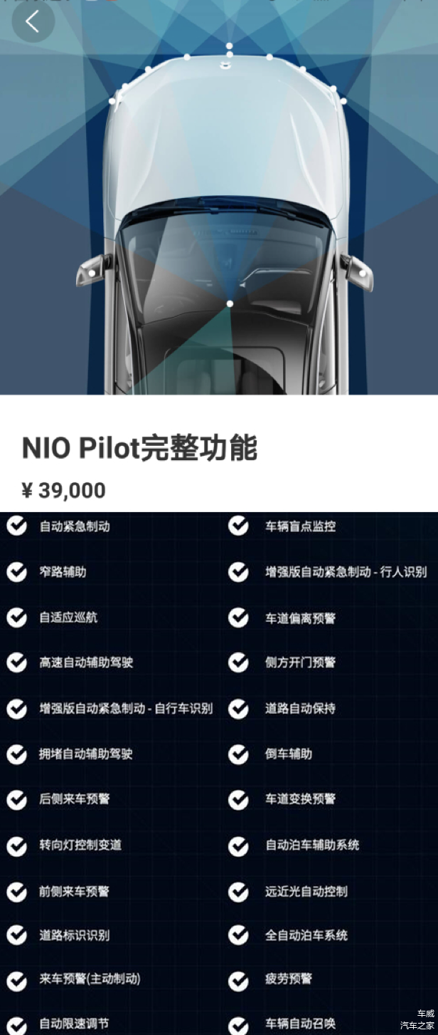 6个选装项目中最高大上的就属NIO Pilot自动辅助驾驶系统了,该套设备配备了360度全方位自动感知系统,带有Mobile Eye q4自动驾驶芯片并具备持续学习、快速升级的能力,这套系统能够实现22项功能,囊括了时下主流的主动安全及自动驾驶技术,另外该系统所应用的雷达,摄像头等零部件均由BOSCH,Mobileye等知名供应商提供。