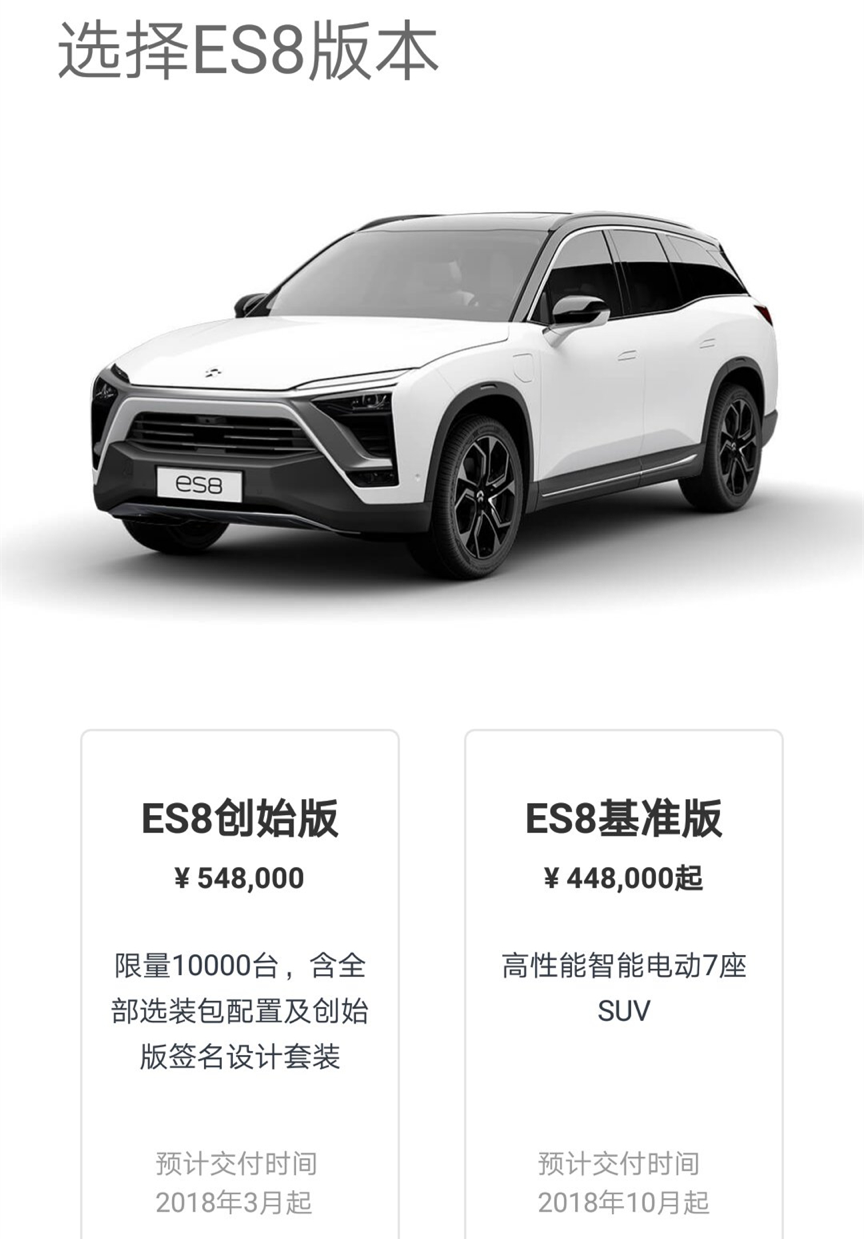 2017年12月16日,蔚来旗下首款7座中大型SUV ES8正式上市,新车共推出两款车型,分别为创始版和基准版,其中创始版可看作为顶配车型,六项选装配置都为标配,另外创始版仅限量销售10000辆,并先于基准版车型提前交付车主。