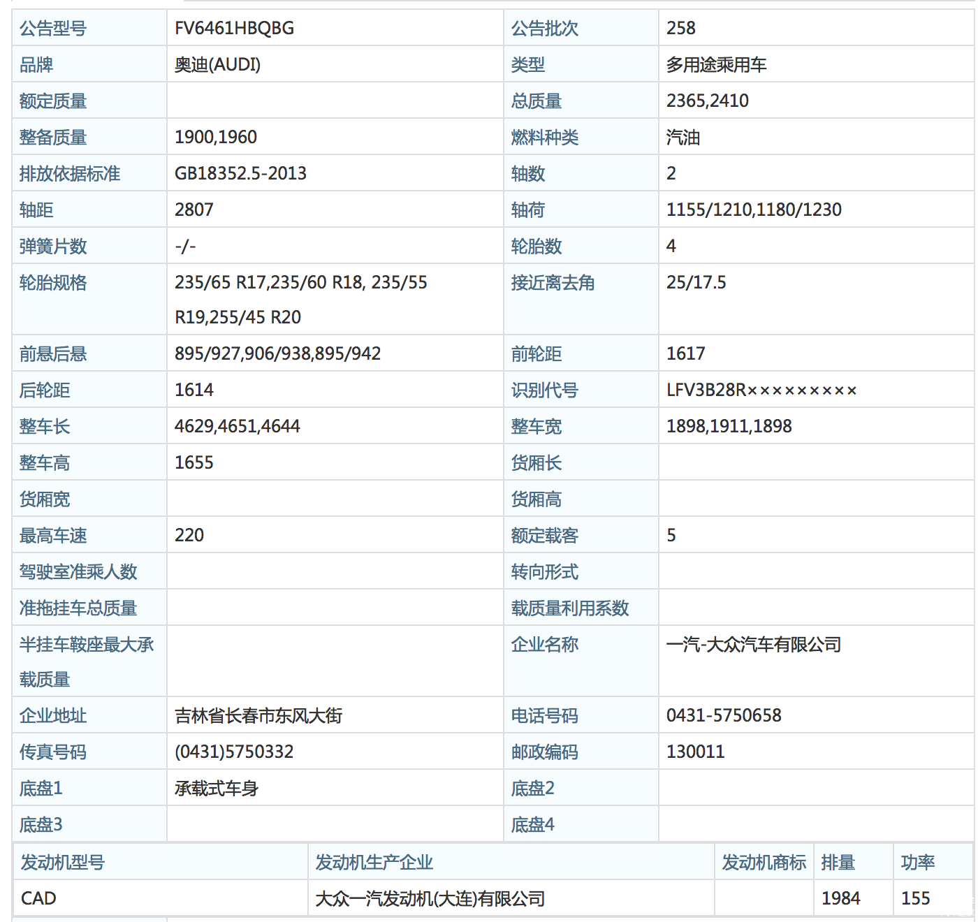 如FV6461HBQBG,就可以查到相应批次的奥迪Q5 2.0T车型
