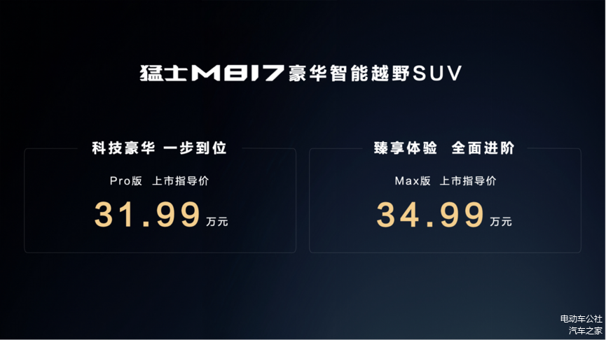 8月17日,东风 猛士M817(图片 | 参数 | 询价)上市。新车共推出两款车型,售价31.99-34.99万元。具体售价及权益如下: