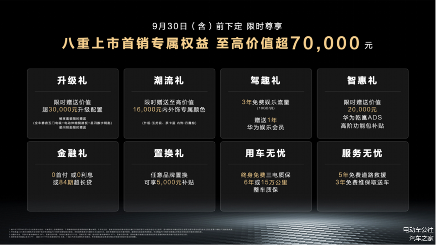 配置方面,新车配备Nappa真皮座椅、前排座椅加热/通风/按摩、方向盘加热、后排座椅加热、空悬+CDC、±10°后轮转向、带主动降噪的18扬声器丹拿音响、电动伸缩踏板、五门电吸门等,后备厢容积828L,后排放倒后可拓展至2112L。辅助驾驶方面,新车搭载华为ADS 4,配备192线激光雷达、4D毫米波雷达等感知硬件,能实现车位到车位的辅助驾驶功能及异形障碍物自动紧急制动等主动安全功能。