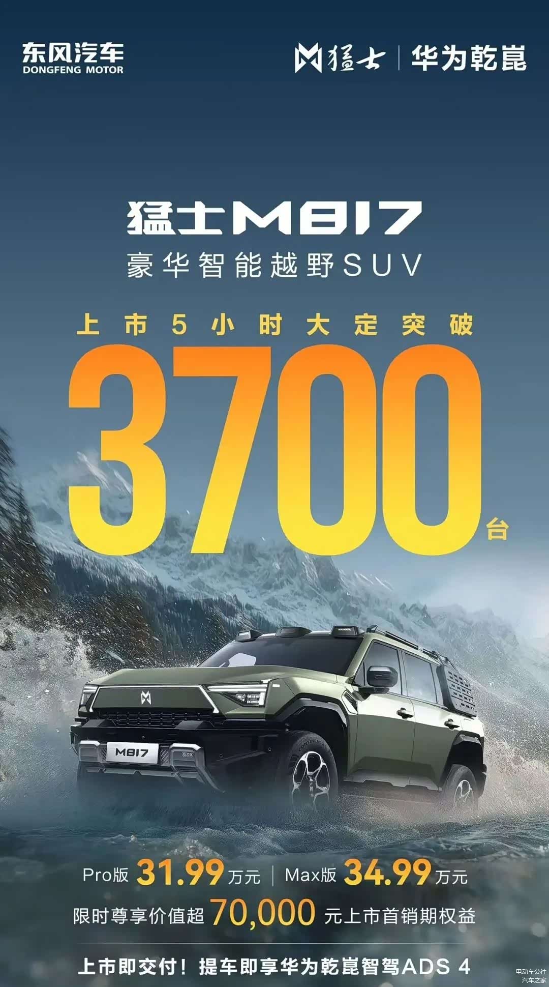 作为东风猛士与华为深度合作的第一款车型,M817可能是这个级别里比较少见的“六边形战士”了:比它舒服空间大的没它能越野,比它能越野的没它智能,比它智能的又没它全面,比它全面的又没它性价比高。从5小时大定3700台的销量来看,这台车已经具备了一定的破圈能力。