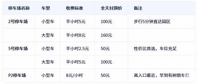 2号停车场小型车:半小时5元,全天最高限价100元。大型车:半小时8元,全天最高限价160元。5号停车场小型车:半小时2.5元,全天最高限价50元。大型车:半小时5元,全天最高限价100元。P2停车场小型车:8元/小时,全天封顶50元。