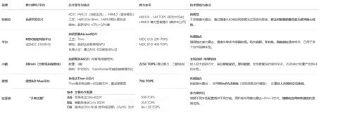 除了感知硬件以外,智能驾驶的算力硬件和芯片竞赛也日趋白热化。下面整理了一个表格,可以让大家快速了解各家的核心配置和特点: