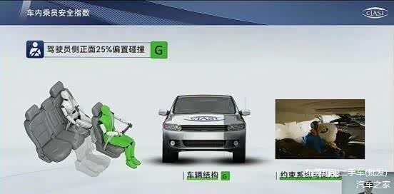 让我们关注一下车内乘员安全指数,别克世纪评出G级,其中正面25%偏置碰撞、侧面碰撞、车顶强度、座椅/头枕四项均为G级。最值得关注的是正面25%偏置碰撞,它比100%正面碰撞更可能发生事故,也更能体现安全性。