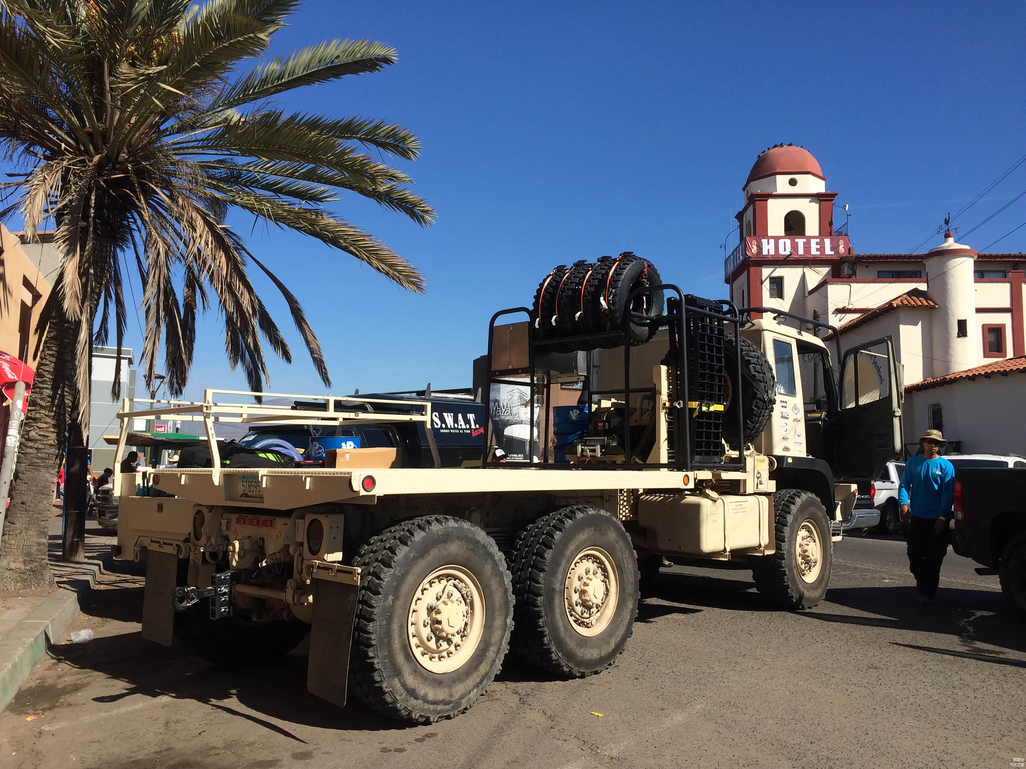 从圣迭戈机场驱车20分钟左右就到美墨国境线了。因为皮卡后斗的行李太多,被海关工作人员叫去路边象征性的过了下X光,当得知我们是去参加Baja 1000时,警察笑了笑伸了个大拇指就放我们走了。出了检查站发现我们已经行驶在墨西哥的高速路上了,这个海关简直比过收费站还容易,看来川普的城墙只是单向的。。。