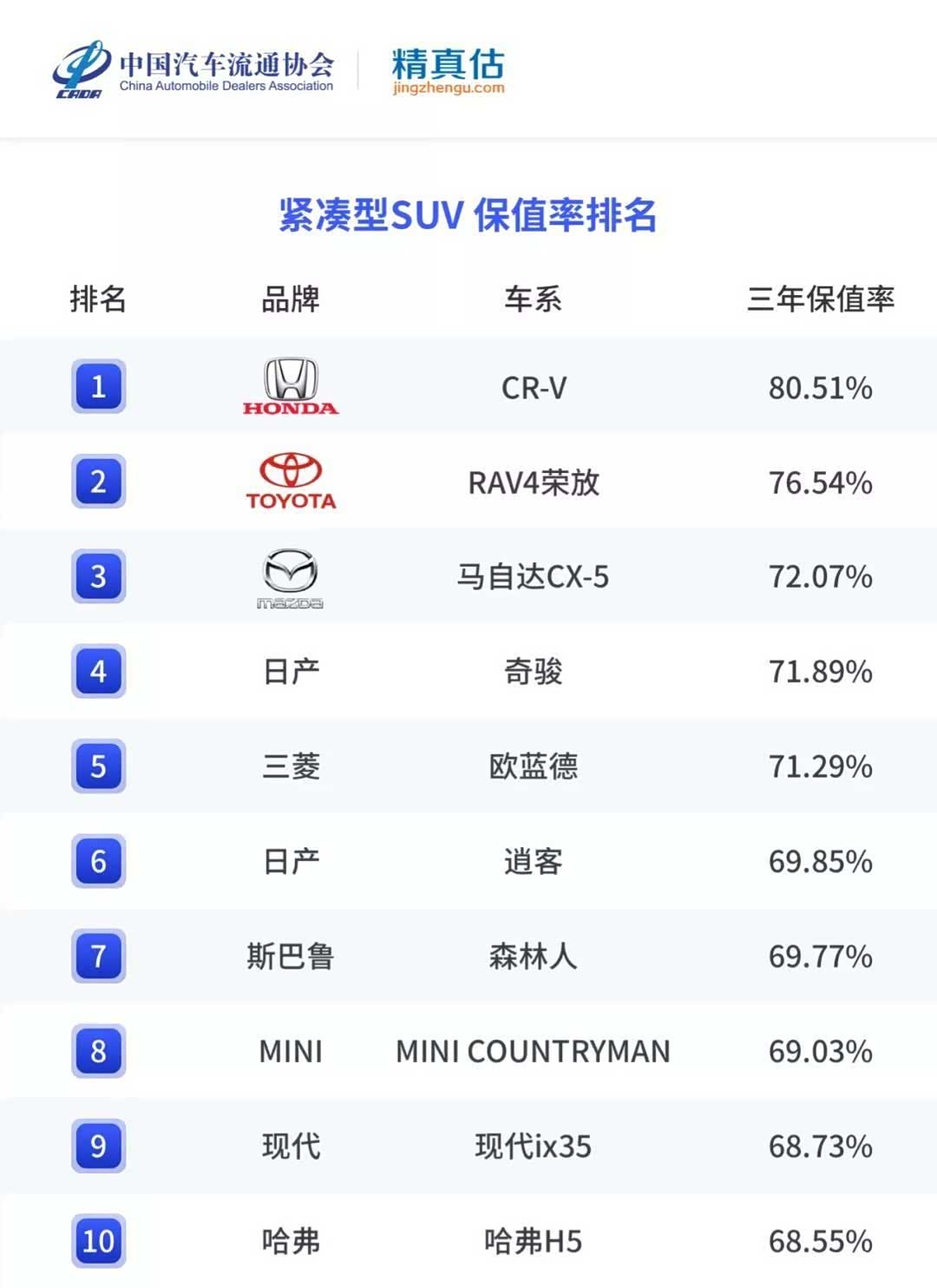 紧凑型SUV保值率:日系优势显著,CR-V超80%
