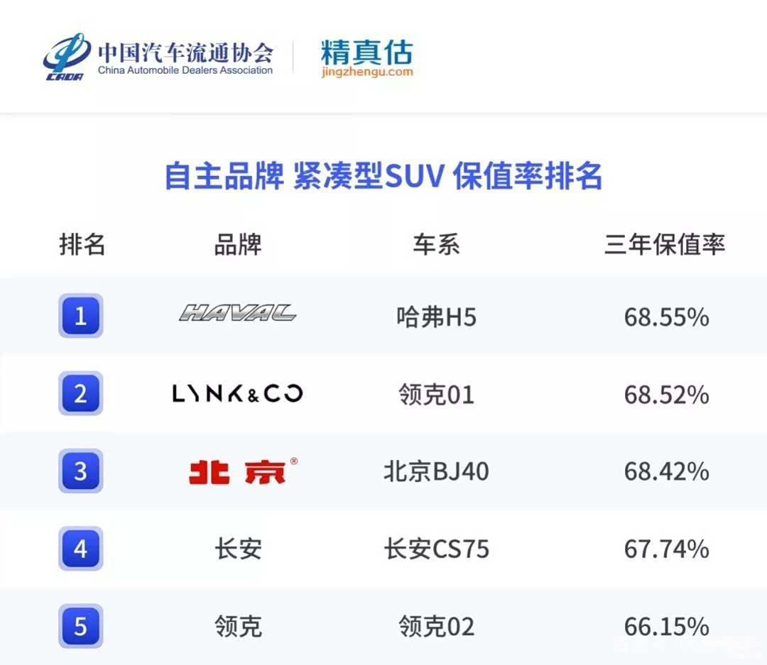 自主紧凑型SUV排名前五的分别是,哈弗H5、领克01、北京BJ40、长安CS75、领克02,三年保值率均在65%以上。领克2款车型在榜。