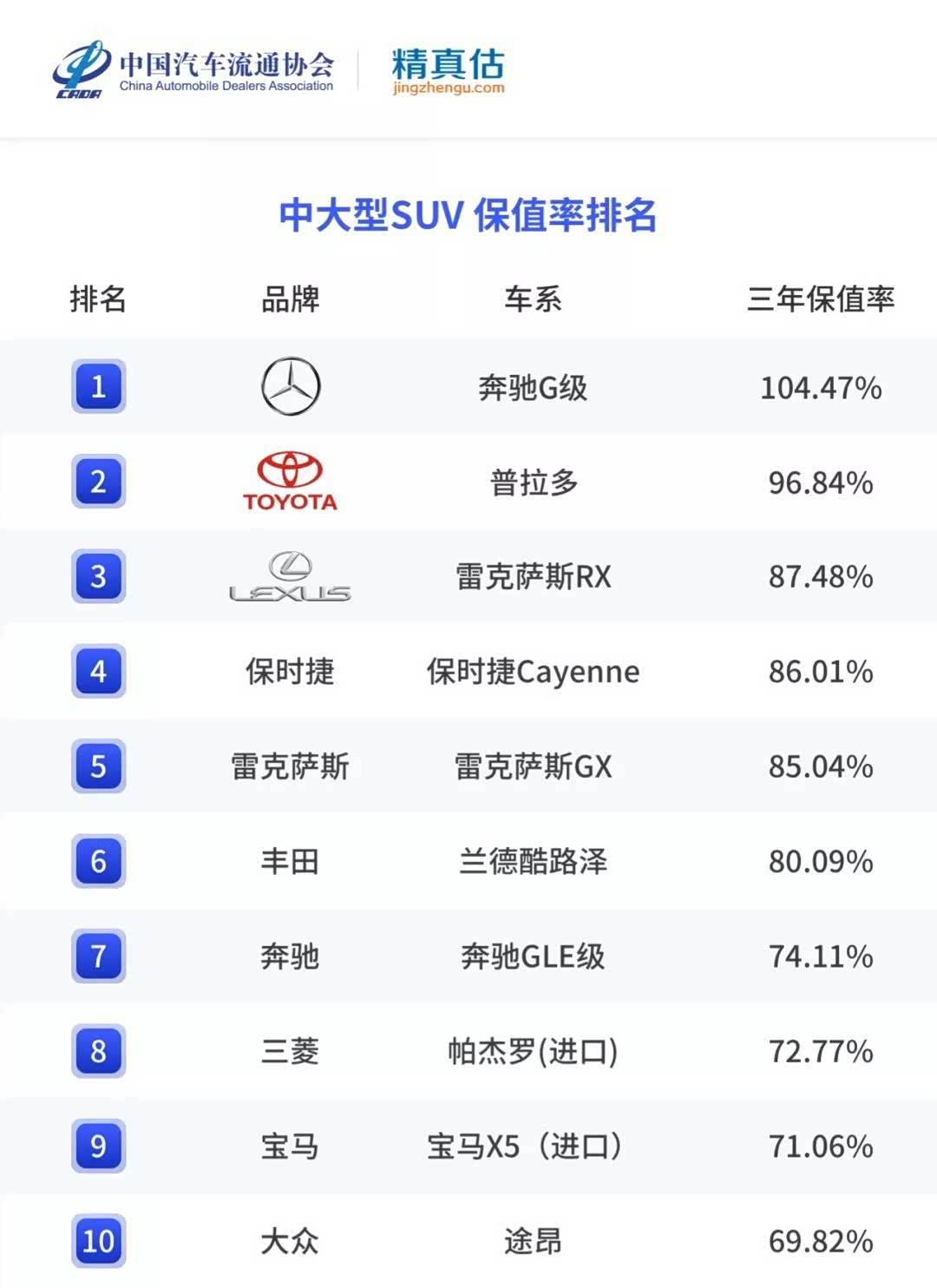 中大型SUV保值率:6款车型超80%,奔驰G级二手高于原价
