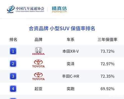 合资方面仍然是日系车型优势明显,东风本田XR-V/广汽本田缤智和一汽丰田奕泽/广汽丰田C-HR这两对兄弟车型纷纷上榜。另外,奕跑也以69.92%的保值率排在合资第4位。