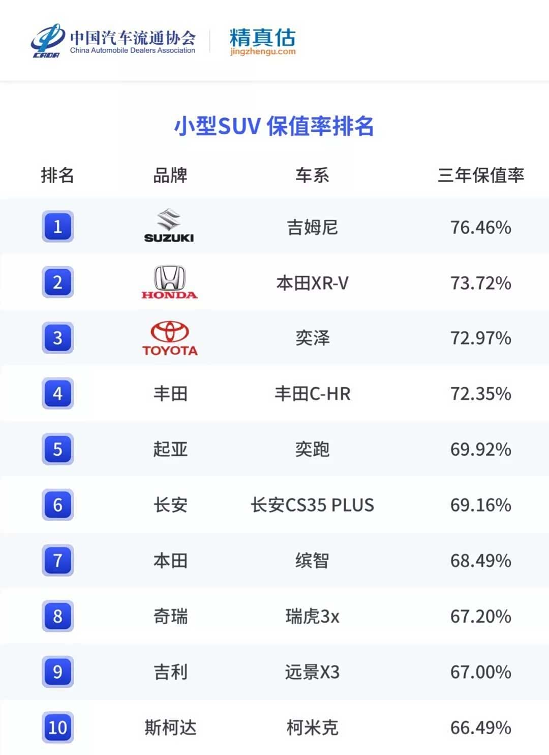 小型SUV保值率:吉姆尼排第一,自主3款榜上有名