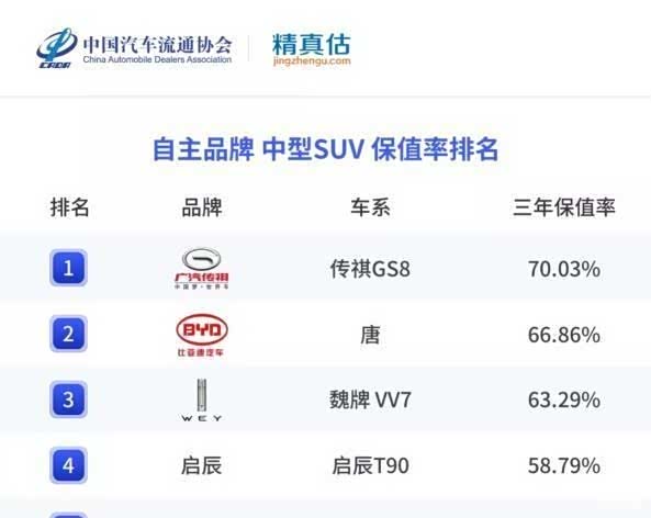 自主品牌中型SUV的表现一般,仅有广汽传祺GS8、比亚迪唐、魏牌VV7这3款车型的保值率高于60%。