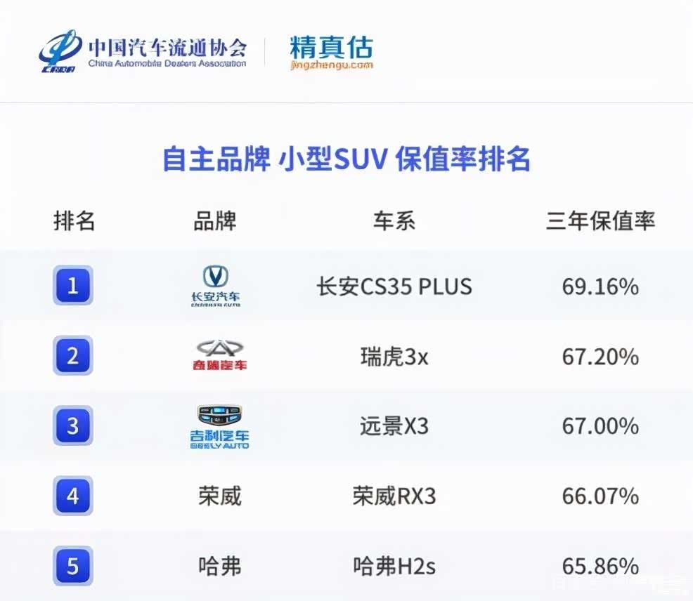 小型SUV方面,自主品牌位居第一的是长安CS35PLUS,3年保值率达到69.16%,其余的瑞虎3x、远景X3、荣威RX3、哈弗H2s的保值率也均超过65%。