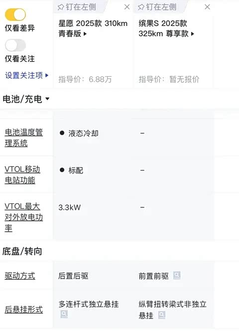我们还可以把在售的6.88万元的星愿与预售6.88万元的缤果S进行对比。在动力数据上,缤果S最大功率75千瓦,比星愿的58千瓦要高一些,轴距要比星愿小40毫米。缤果S是传统的前置电机,而星愿采用了后置电机,星愿的后悬挂是多连杆独立悬挂,缤果S是纵臂扭转梁式非独立悬挂,比较起来星愿的操控性能和底盘明显比缤果S好。同时,星愿的电池有液冷技术和外放电功能,缤果S只有高配才支持外放电。缤果S的优势主要体现在手机无线充电和化妆镜方面。