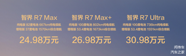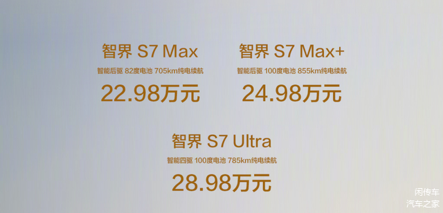 而动力方面,智界R7依旧提供增程式和纯电动总成,1.5T发动机最大功率156马力,匹配的是华为电机309马力和520马力,纯电版本则是292马力后置电机或496马力双电机组成电控四驱系统,与老款车型基本相同,电池也没有太大的变化,纯电续航里程251公里起步,最高可达802公里。智界S7则更加简单一些,只有电动的版本,电动机参数基本相同,纯电续航里程最高可达855公里,有着更加出色的表现,非常值得期待。