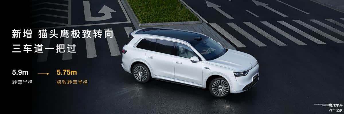 新增猫头鹰极致转向,极致转弯半径5.75m,三条车道一把过,让全尺寸SUV像轿车一样好开。新增横向风稳定控制,毫米级横向风识别,动态调整悬架硬度,自动校正行车方向,降低大风天气下行车风险。