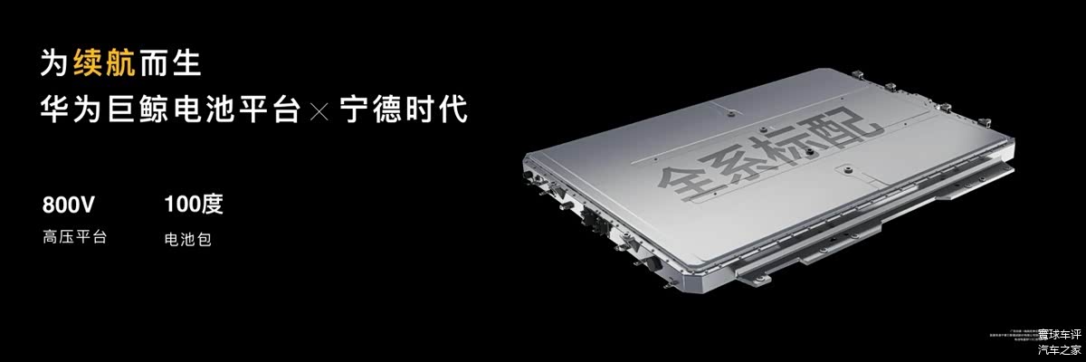 搭载华为巨鲸800V高压平台,全系标配宁德时代100kWh三元锂电池。可实现至高705km[6]续航能力,跑得远、续航无忧。电池从30%充电至80%,仅需15分钟,一杯咖啡,即可满电出发。