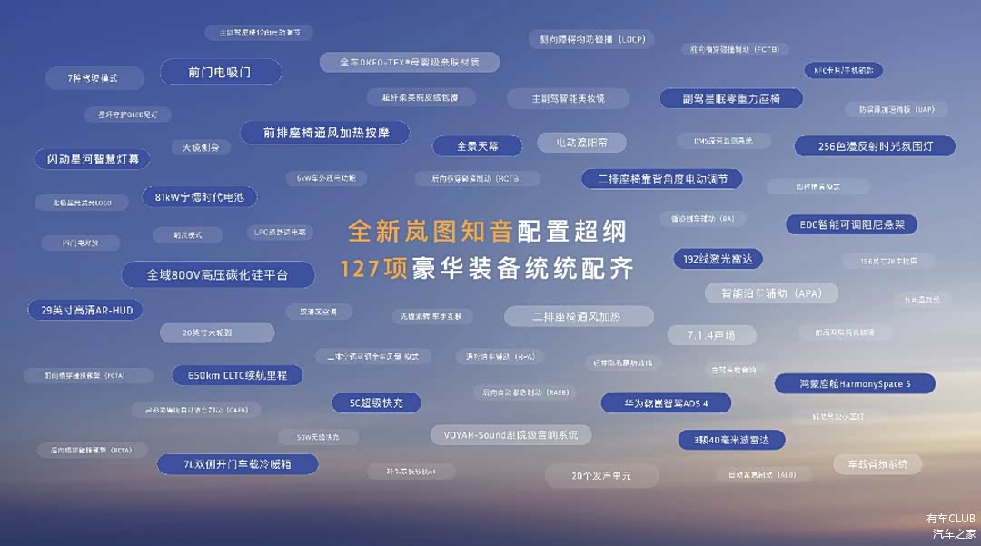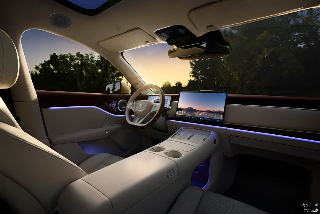 新车内饰主打“繁星拥抱座舱”理念,中控台配贯穿式木纹饰板与怀挡设计,提供旭日红、皓月白、深海蓝3种颜色可选。配备10.25英寸全液晶仪表以及15.6英寸悬浮式多媒体触控屏,搭配高通骁龙8295P芯片,内置鸿蒙座舱HarmonySpace5系统。驾驶员前方还配备29英寸AR-HUD抬头显示系统,方向盘造型升级为三辐式设计,滑轮按键造型更为简洁。前排副驾提供零重力座椅,四座均配备加热、通风和按摩功能,二排座椅支持11-127度无级调节,还可一键放倒与后备厢拉通扩展储物容积。车内5.2㎡实用空间,后排腿部空间达1038mm。全车共设有35处储物点位,包括72L隐私储物格,以及7L的冷暖冰箱,还配备了带有头枕音响的Voyah SOUND剧院级音响系统。
